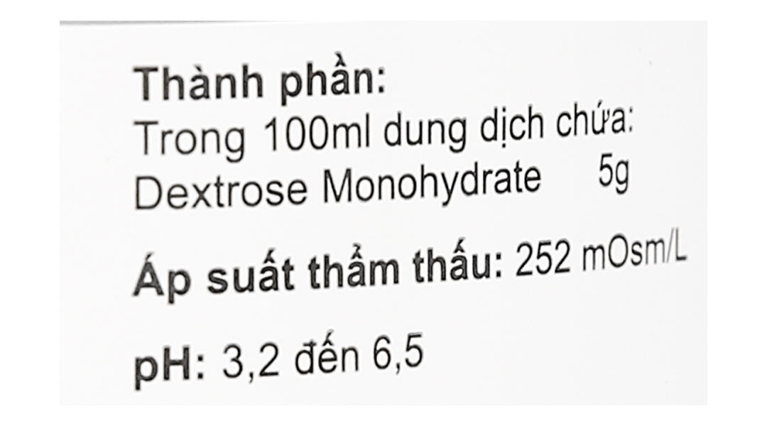 Dung dịch Dextrose 5% là một dung dịch của Dextrose Monohydrate trong nước, được dùng để tiêm truyền. Là dung dịch vô trùng, không có chí nhiệt độ, không màu, không có hạt phân tử nhỏ, không chứa các tác nhân kháng khuẩn.