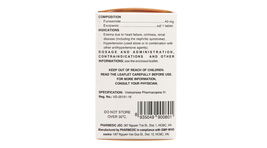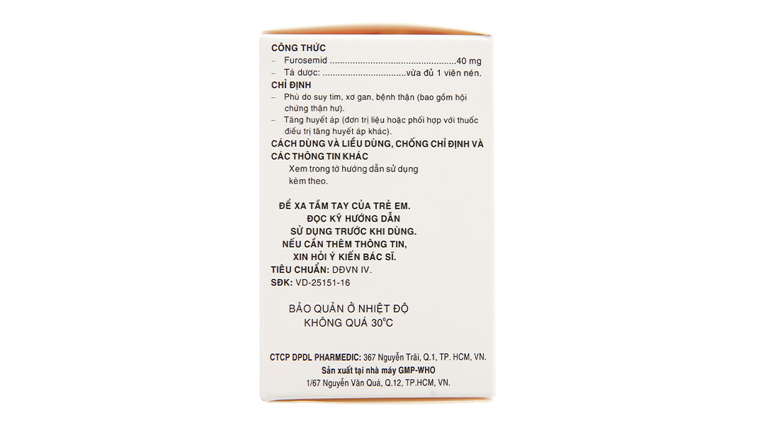 – Thận trọng khi sử dụng– Theo dõi các chất điện giải, đặc biệt là natri và kali, tình trạng hạ huyết áp, bệnh gút, bệnh đái tháo đường, suy thận, suy gan. Tránh dùng bệnh nhân suy gan nặng. Giảm liều ở người già để giảm nguy cơ độc với thính giác. Khi nước tiểu ít, phải bù đủ thể tích máu trước khi dùng thuốc. – Thận trọng khi dùng furosemid ở trẻ em, nhất là khi dùng kéo dài. Phải theo dõi cẩn thận cân bằng nước và điện giải. Trẻ sơ sinh thiếu tháng khi dùng furosemid có thể có nguy cơ bị bệnh còn ống động mạch. Furosemid chiếm chỗ của biliburin tại vị trí gắn albumin, phải dùng thận trọng ở trẻ em bị vàng da. Độ thanh thải của furosemid ở trẻ sơ sinh chậm hơn nhiều so với người lớn, nửa đời thải trừ trong huyết tương dài gấp 8 lần, phải tính toán khi dùng liều nhắc lại. – Thận trọng người bệnh phì đại tuyến tiền liệt hoặc đái khó vì có thể thúc đẩy bí tiểu tiện cấp. Dùng furosemid được coi là không an toàn ở bệnh nhân bị rối loạn chuyển hóa porphyrin, vì thường kèm với đợt cấp của bệnh. – Ở bệnh nhân giảm năng tuyến cận giáp, dùng furosemid có thể gây co cứng cơ do giảm calci huyết. – Trong thành phần thuốc có lactose, do đó nên thận trọng ở những bệnh nhân có vấn đề di truyền hiếm gặp trong việc không dung nạp galactose, thiếu hụt lactase hoặc hội chứng kém hấp thu glucose-galactose. – Thai kỳ và cho con búPhụ nữ mang thai: thận trọng khi dùng và chỉ dùng khi cân nhắc kỹ lợi ích và nguy cơ. Phụ nữ cho con bú: thuốc có nguy cơ ức chế sữa, trường hợp này nên ngừng cho con bú. – Khả năng lái xe và vận hành máy mócGiảm sự tỉnh táo tinh thần, chóng mặt và nhìn mờ đã được báo cáo, đặc biệt là vào lúc bắt đầu điều trị, với những thay đổi liều lượng và kết hợp với rượu .Bệnh nhân nên biết rằng nếu bị ảnh hưởng họ không nên lái xe, vận hành máy móc hoặc tham gia vào các hoạt động mà những hiệu ứng có thể đặt mình hoặc người khác có nguy cơ. – Tương tác thuốcCác thuốc lợi niệu khác: làm tăng tác dụng của furosemid. Các thuốc lợi niệu giữ kali có thể làm giảm sự mất kali khi dùng furosemide. Kháng sinh: Cephalosporin làm tăng độc tính thận, aminoglycosid làm tăng độc tính với tai và thận, vancomycin làm tăng độc tính tai. Muối lithi: làm tăng nồng độ lithi trong máu, có thể gây độc. Nên tránh dùng nếu không theo dõi được nồng độ lithi huyết chặt chẽ. Glycosid tim: làm tăng độc tính của glycosid trên tim do furosemide làm hạ kali huyết. Cần theo dõi kali huyết và điện tâm đồ. Thuốc chống viêm không steroid: làm tăng nguy cơ độc với thận, giảm tác dụng lợi tiểu. Corticosteroid: tăng nguy cơ giảm kali huyết, đối kháng với tác dụng lợi tiểu. Các thuốc chống đái tháo đường: làm giảm tác dụng hạ glucose huyết của thuốc chống đái tháo đường. Cần theo dõi và điều chỉnh liều Thuốc giãn cơ không khử cực: làm tăng tác dụng giãn cơ. Thuốc chống đông: làm tăng tác dụng chống đông. Cisplatin: làm tăng độc tính tai và thận. Các thuốc hạ huyết áp: làm tăng tác dụng hạ huyết áp. Nếu phối hợp cần điều chỉnh liều. Đặc biệt, khi phối hợp với thuốc ức chế enzyme chuyển angiotensin, huyết áp có thể giảm nặng. Thuốc chống động kinh: phenytoin làm giảm tác dụng của furosemide, carpamazepin làm giảm natri huyết. Cloral hydrat: gây hội chứng đỏ bừng mặt, nhịp tim nhanh, tăng huyết áp, toát mồ hôi. Probenecid: làm giảm thanh thải qua thận của furosemid và giảm tác dụng lợi niệu. Thuốc ức chế thần kinh trung ương (clorpromazin, diazepam, clonazepam, halothan, ketamin): tăng tác dụng giảm huyết áp. |