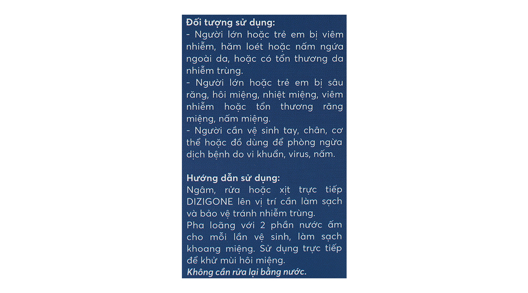 Pha loãng Dizigone với 2 phần nước ấm, sử dụng dung dịch thu được để ngâm, lau rửa vùng cần làm sạch và sát khuẩn.