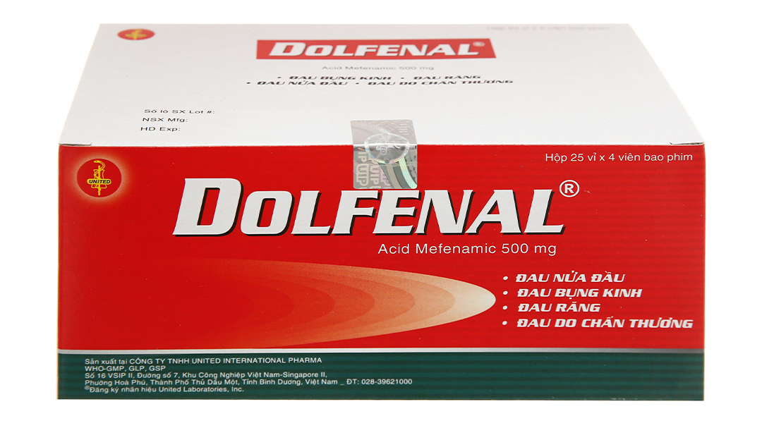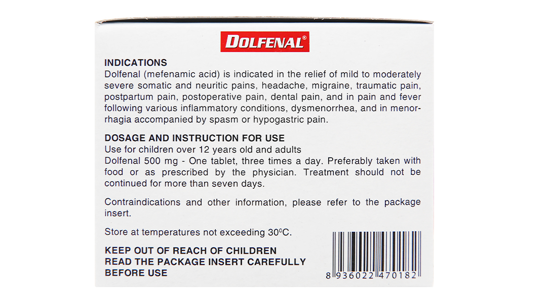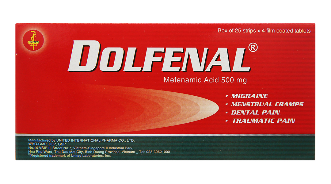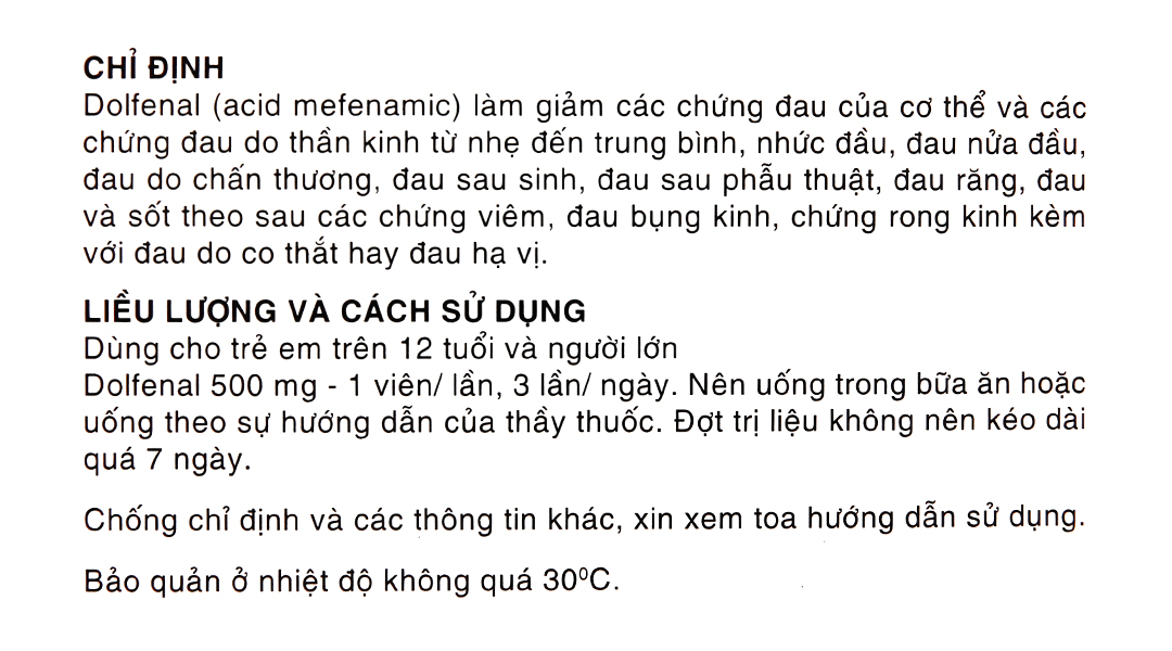Dolfenal (acid mefenamic) làm giảm các chứng đau của cơ thể và các chứng đau do thần kinh từ nhẹ đến trung bình, nhức đầu, đau nửa đầu, đau do chấn thương, đau sau sinh, đau sau phẫu thuật, đau răng, đau và sốt theo sau các chứng viêm, đau bụng kinh, chứng rong kinh kèm với đau do co thắt hay đau hạ vị.