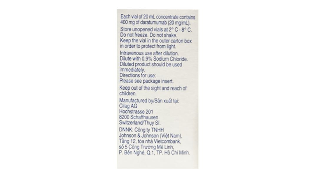 - Thành phần dược chất: Daratumumab 400 mg (20 mg daratumumab mỗi mL).