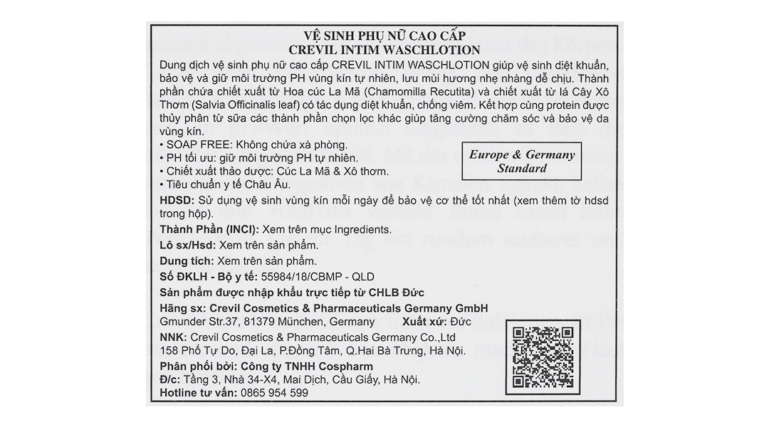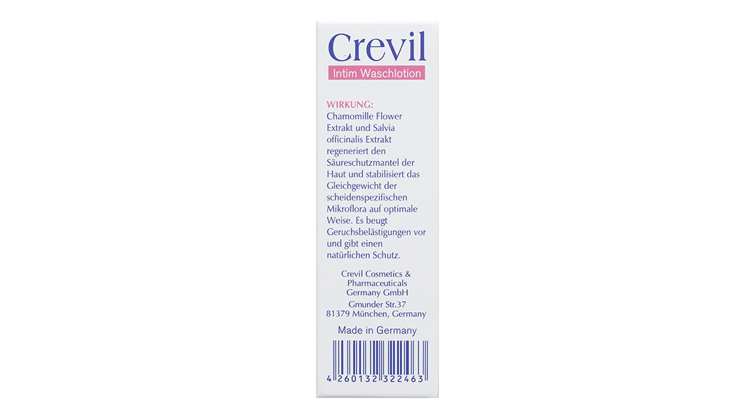 Thành phần chứa chiết xuất từ hoa cúc La Mã (Chamomilla Recutita), chiết xuất từ lá Cây Xô Thơm (Salvia Officinalis leaf), protein được thủy phân từ sữa cùng các thành phần khác, công thức và tiêu chuẩn y tế Châu Âu, dung dịch vệ sinh phụ nữ CREVIL INTIM WASCHLOTION giúp vệ sinh diệt khuẩn, kháng viêm, hỗ trợ điều trị các bệnh viêm nhiễm phụ khoa, bảo vệ môi trường pH tự nhiên, giữ da mềm mại và lưu mùi hương nhẹ nhàng dễ chịu.