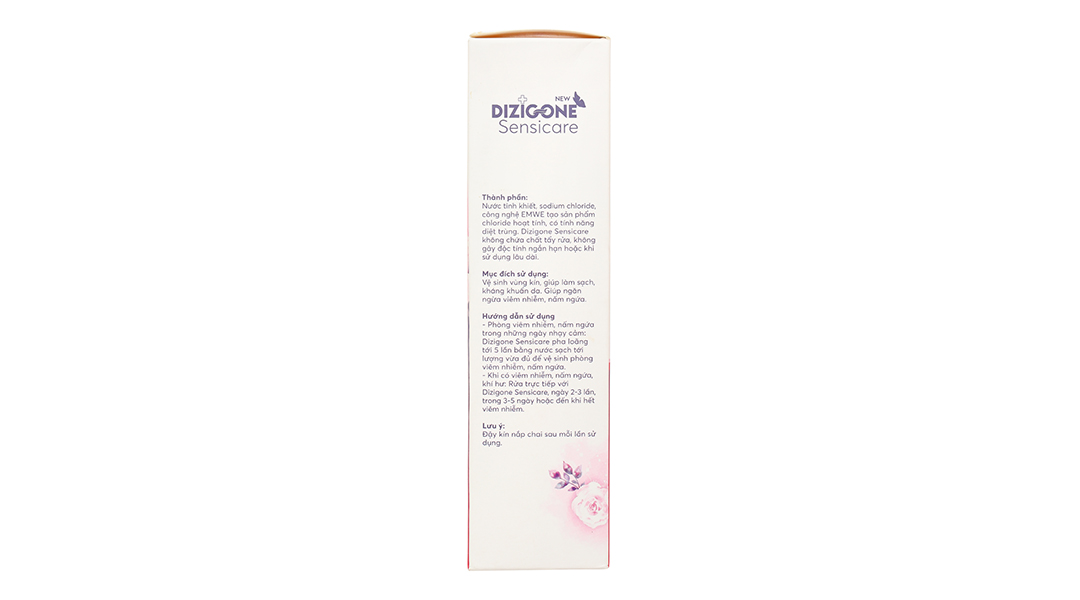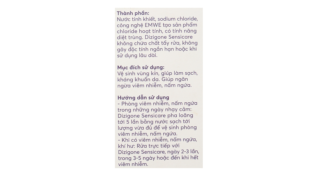 Nước tinh khiết, Sodium chloride, công nghệ EMWE tạo sản phẩm chloride hoạt tính, có tính năng diệt trùng. Dung dịch vệ sinh phụ nữ Dizigone Sensicare không chứa chất tẩy rửa, không gây độc tính ngắn hạn hoặc khi sử dụng lâu dài.