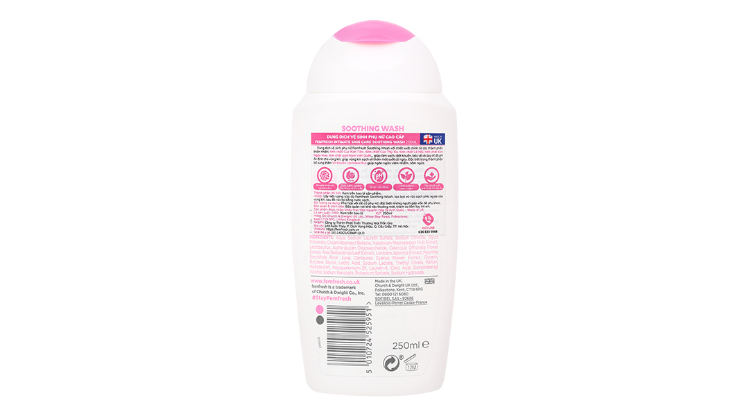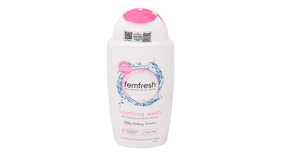 Dung dịch vệ sinh phụ nữ Femfresh Soothing Wash với chiết xuất chính từ các thành phần thiên nhiên: tinh chất Cúc Kim Tiền, tinh chất Cúc Thỷ Xa, tinh chất Lô Hội, tinh chất Kim Ngân Hoa, tinh chất quả Nam Việt Quất… giúp làm sạch, diệt khuẩn, bảo vệ và duy trì pH ổn định cho vùng kín, giúp vùng kín sạch sẽ thơm mát suốt cả ngày. Đặc biệt trong thành phần bổ sung thêm lợi khuẩn Lactobacillus giúp ngăn ngừa viêm nhiễm, nấm ngứa.