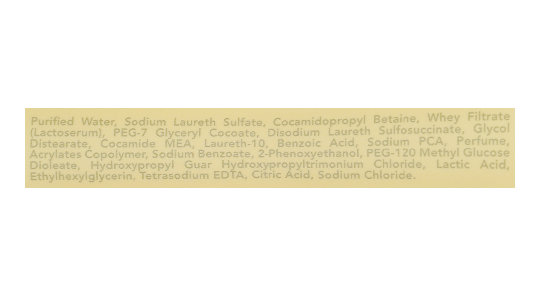 Purified Water, Sodium Laureth Sulfate, Cocamidopropyl Betaine, Whey Filtrate (Lactoserum), PEG-7 Glyceryl Cocoate, Disodium Laureth Sulfosuccinate, Glycol Distearate, Cocamide MEA, Laureth-10, Benzoic Acid, Sodium PCA, Perfume, Acrylates Copolymer, Sodium Benzoate, 2-Phenoxyethanol, PEG-120 Methyl Glucose Dioleate, Hydroxypropyl Guar Hydroxypropyltrimonium Chloride, Lactic Acid, Ethylhexylglycerin, Tetrasodium EDTA, Citric Acid, Sodium Chloride.