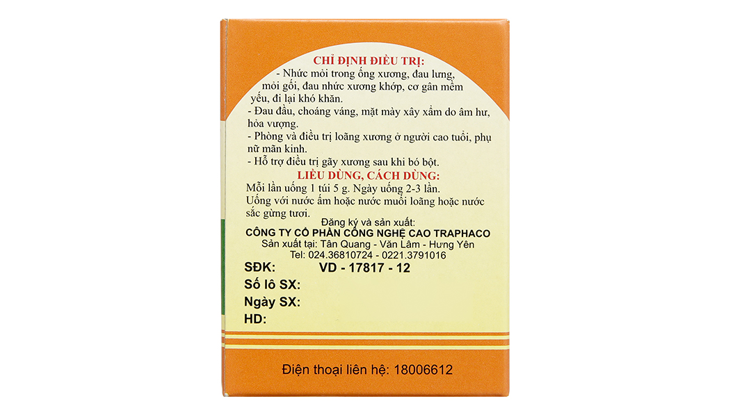Công dụngTrị nhức mỏi trong ống xương, đau lưng, đau nhức xương khớp, phòng và trị loãng xương,...