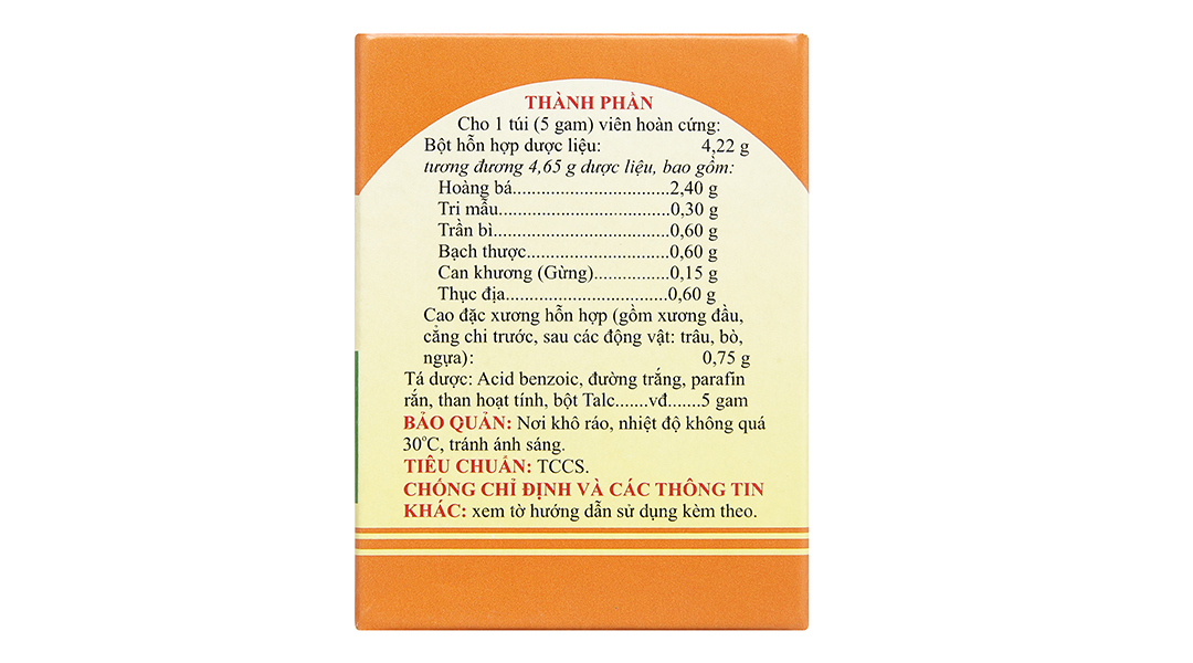 Hoạt chấtTrần bì, Tri mẫu, Can khương, Thục địa, Bạch thược, Hoàng bá, Cao đặc xương hỗn hợp