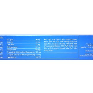 Phụ liệu: vỏ nang gelatin, chất độn (lactose, cellulose vi tinh thể, tinh bột), chất chống đông vón (magie stearat, aerosil, talc), polyvinylpyrrolidone K30 (PVP K30) vừa đủ 2 viên.