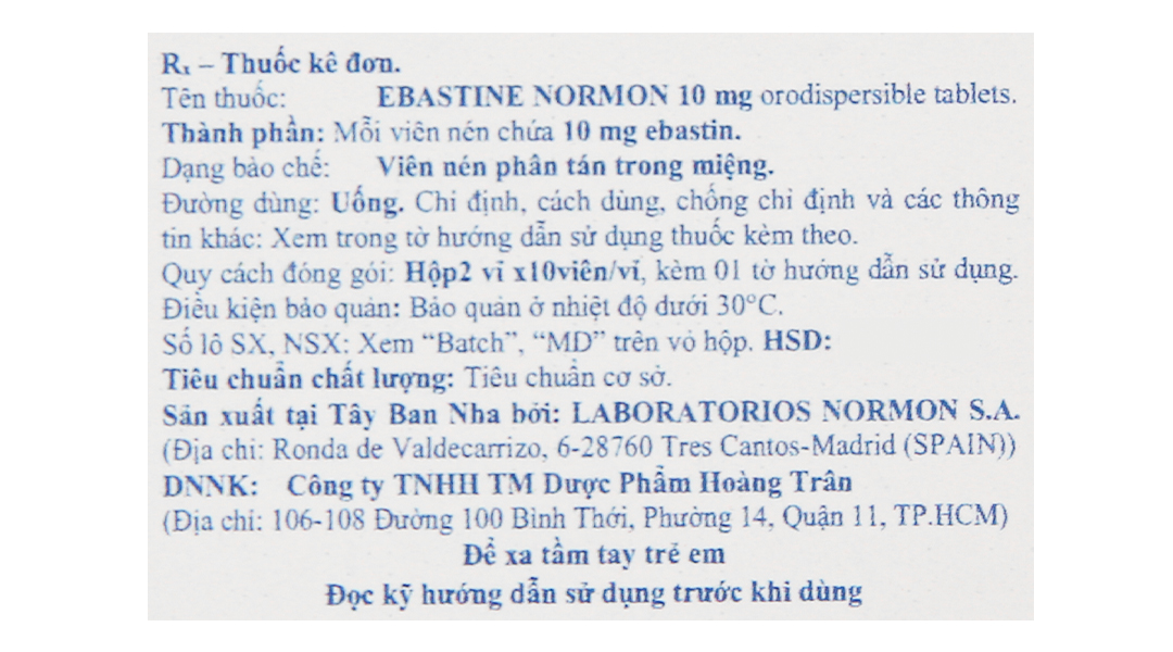 Ebastine Normon 10mg Orodispersible tablets trị viêm mũi, mày đay (2 vỉ x 10 viên)