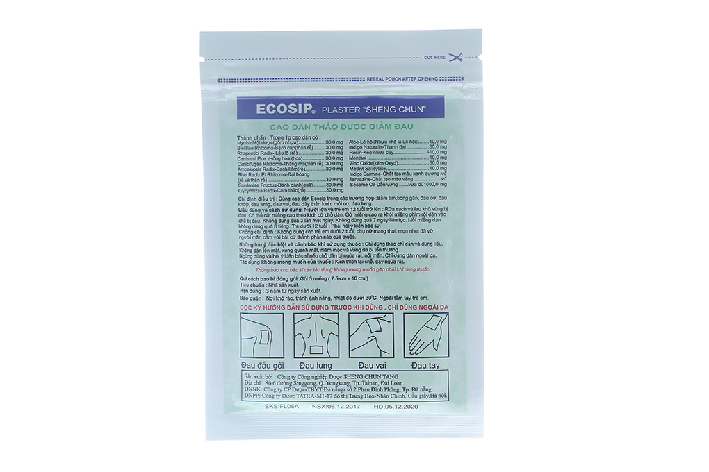 Dùng cao dán ECOSIP trong các trường hợp: Bầm tím, bong gân, đau cơ, đau khớp, đau vai, đau dây thần kinh, mỏi cơ, đau lưng.