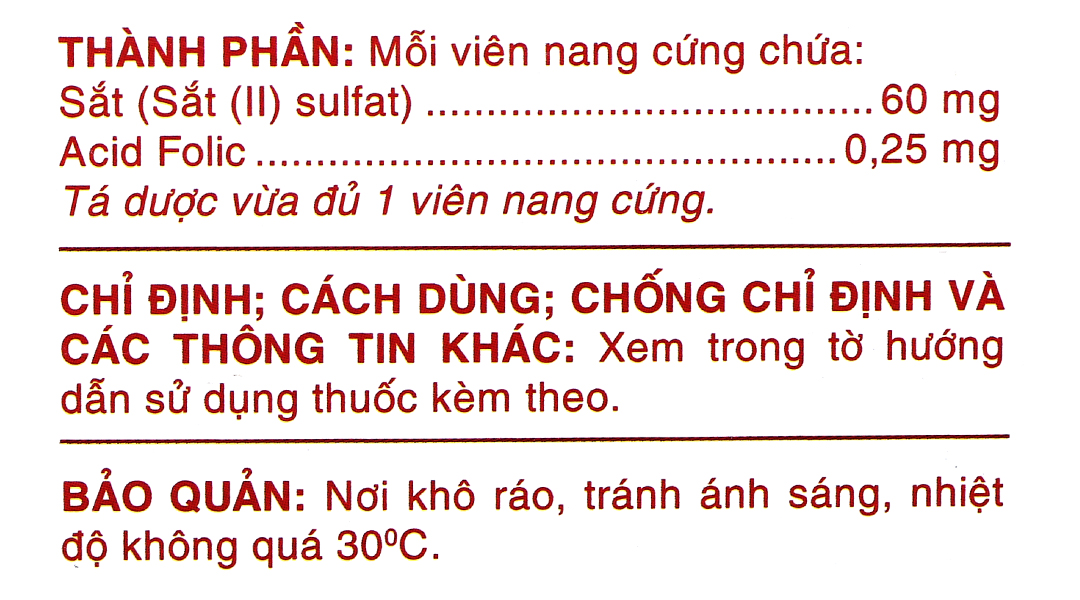 - Hoạt chất: Sắt (Sắt (II) sulfat) 60mg, Acid Folic 0,25mg.