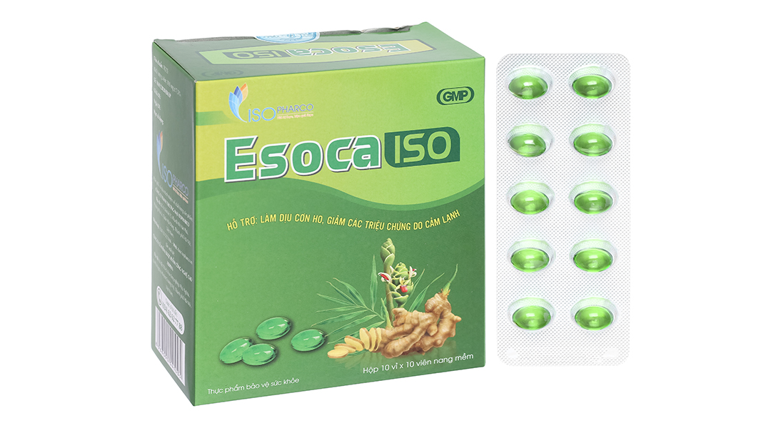 - Esoca Iso chứa các thành phần tự nhiên như tinh dầu tràm, tinh dầu gừng, menthol và tinh dầu tần không chỉ giúp làm dịu cơn ho mà còn hỗ trợ giảm các triệu chứng cảm lạnh như sổ mũi, ngạt mũi, đau họng, mang đến cảm giác dễ chịu và giúp hồi phục sức khỏe hô hấp.