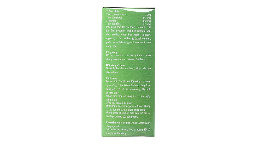 - Sản phẩm này rất phù hợp cho những người bị ho, cảm cúm, đau rát họng, khàn tiếng do nhiễm lạnh, và có thể sử dụng cho cả trẻ em trên 2 tuổi và người lớn. Đặc biệt, nếu trẻ em không thể uống viên nang, có thể dễ dàng cắt vỏ nang và lấy dịch bên trong cho trẻ uống.