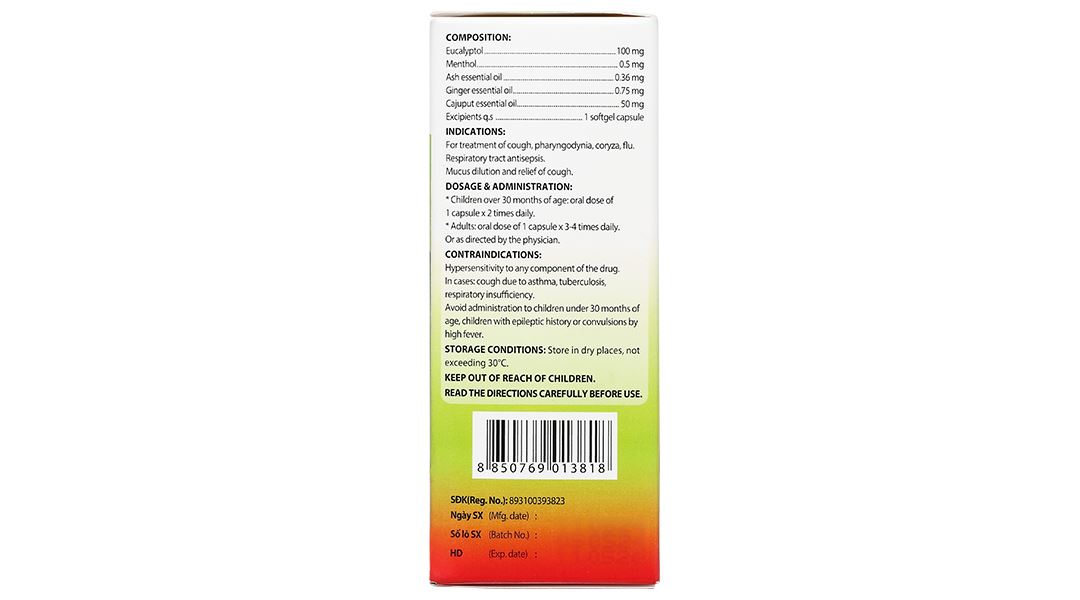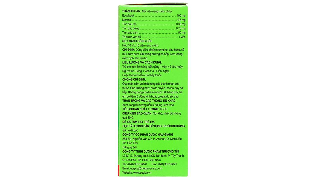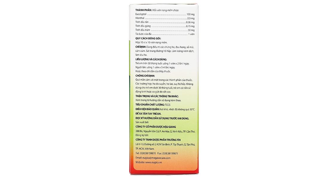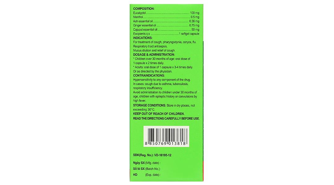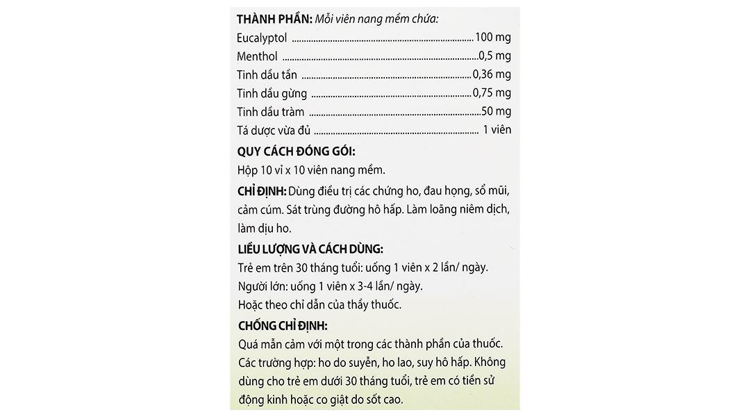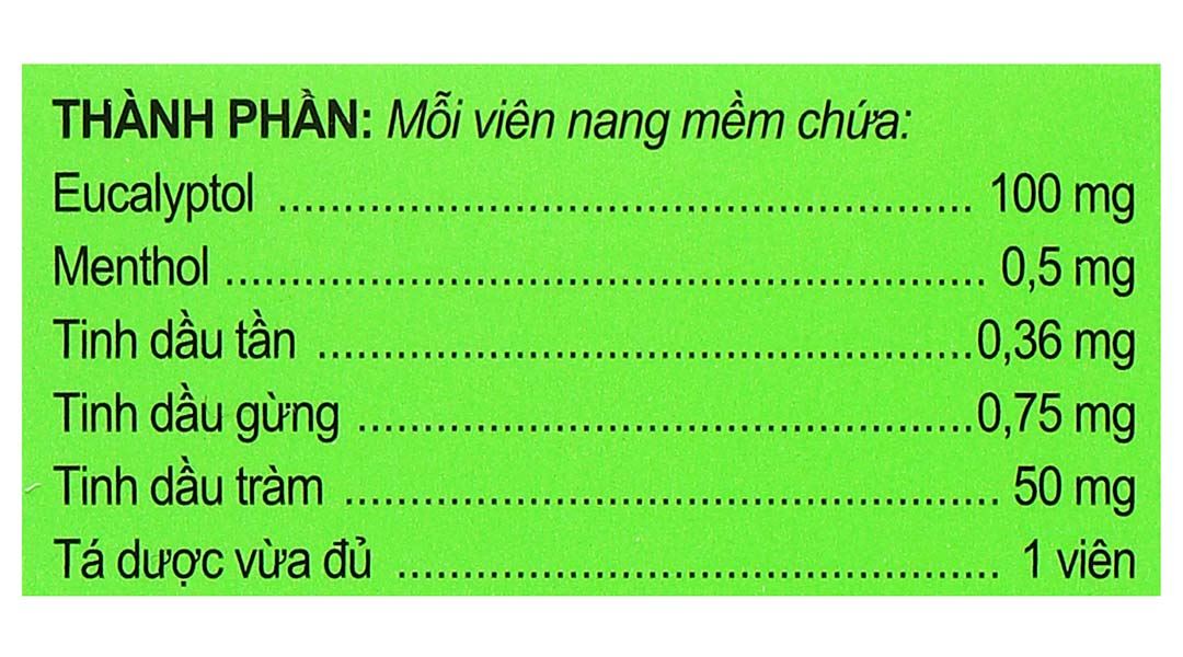 Hoạt chấtEucalyptol, Tinh dầu gừng, Menthol, Tinh dầu tràm, Tinh dầu tần