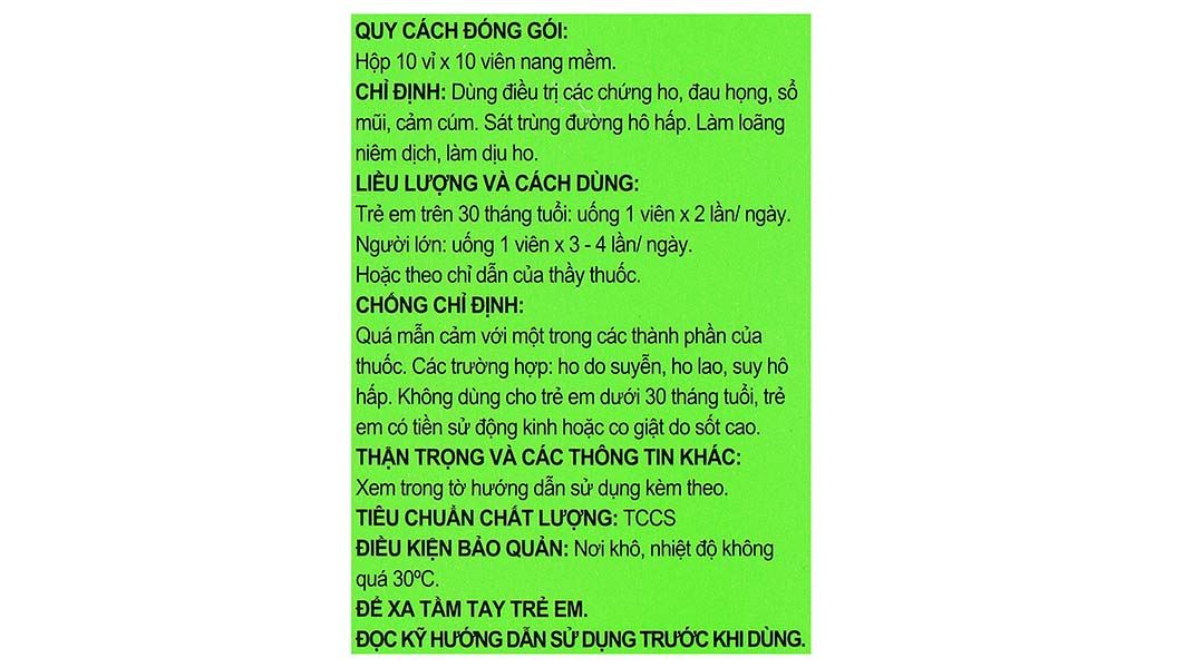 Công dụngTrị ho, đau họng, sổ mũi, sát trùng đường hô hấp, loãng niêm dịch