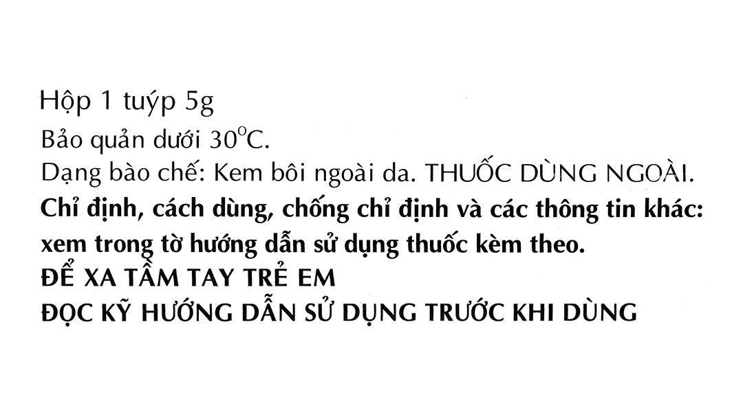 Thuốc chỉ được dùng ngoài da. Chế phẩm này và tất cả các thuốc khác nên được để xa tầm tay trẻ em. Trong trường hợp nuốt phải thuốc, nên ngay lập tức tìm trợ giúp chuyên môn hoặc liên hệ với trung tâm chống độc quốc gia (xem phần Quá liều).