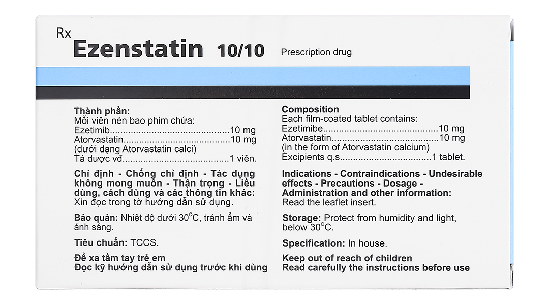 - Thành phần hoạt chất: Mỗi viên EZENSTATIN 10/10 chứa 10 mg ezetimib và 10 mg atorvastatin (dưới dạng atorvastatin calci).