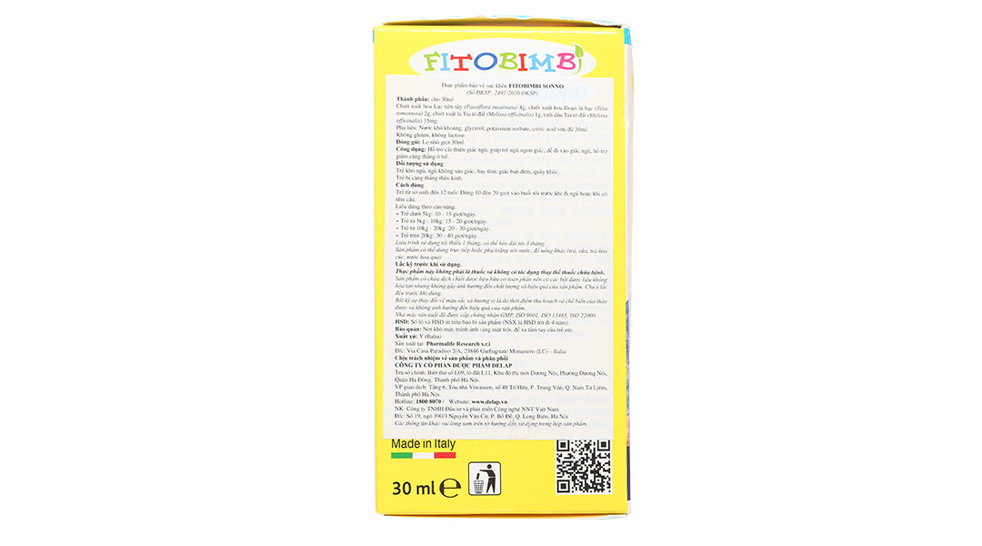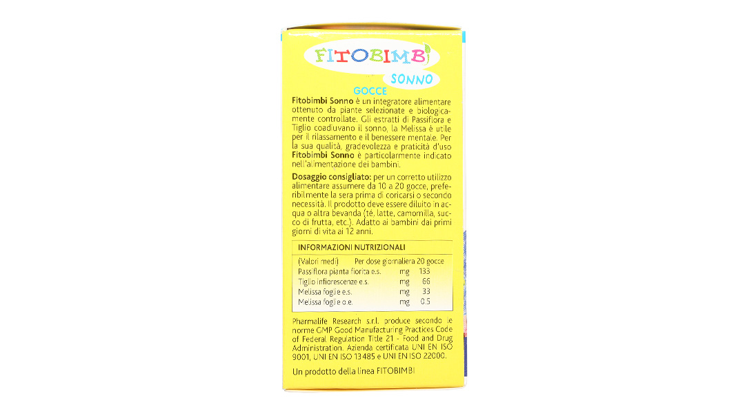 - Sonno Bimbi được nghiên cứu và phát triển bởi Pharmalife Research, Italia – công ty Dược phẩm hàng đầu tại Ý và châu Âu, tạo ra các sản phẩm thảo dược an toàn hiệu quả, chăm sóc và bảo vệ sức khỏe cho trẻ từ 0 – 12 tuổi. Các sản phẩm của Fitobimbi đều có nguồn gốc tự nhiên, được sản xuất trên dây chuyền hiện đại và kiểm soát nghiêm ngặt, đạt các tiêu chuẩn khắt khe như cGMP-FDA, ISO 9001, ISO 22000… Sản phẩm được tin dùng ở hơn 60 quốc gia trên thế giới.