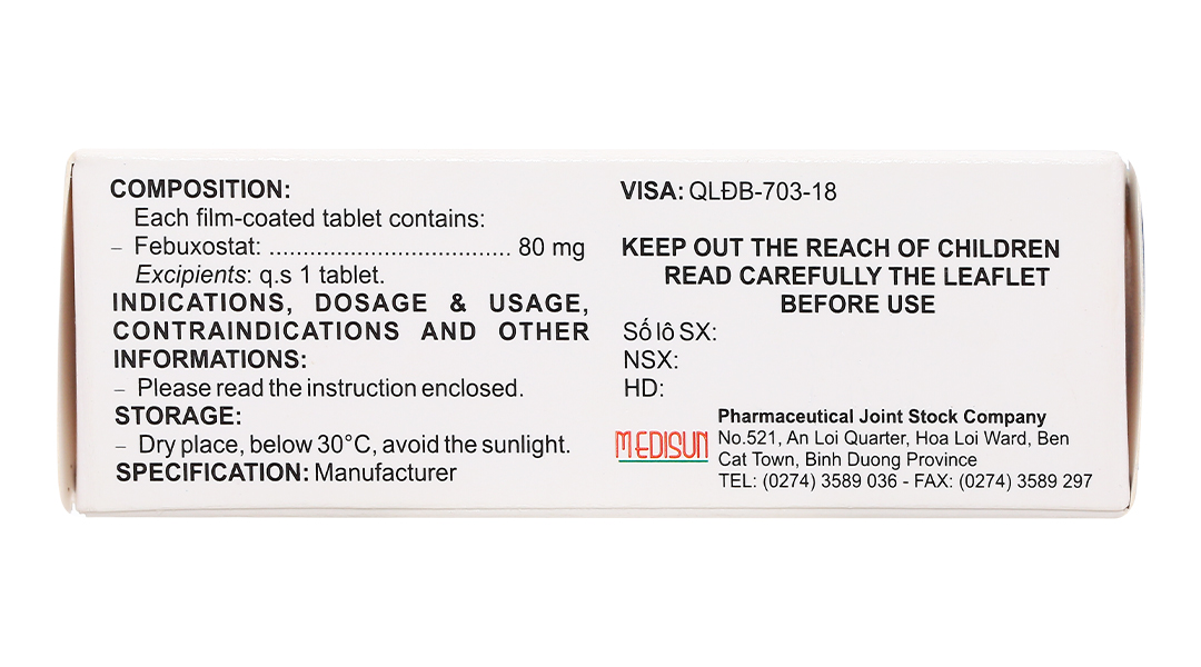 - 1 viên 80 mg febuxostat/ngày. Nếu acid uric huyết > 6 mg/dL (357 pmol/L) sau 2 – 4 tuần: Xem xét tăng liều đến 120 mg, 1 lần/ngày.