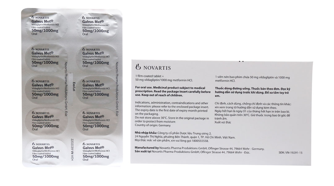 Phần hoạt chất: 50mg vildagliptin và 1000 mg metformin hydrochlorid.