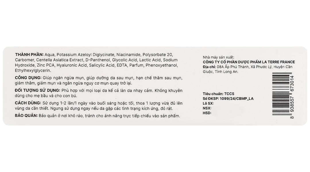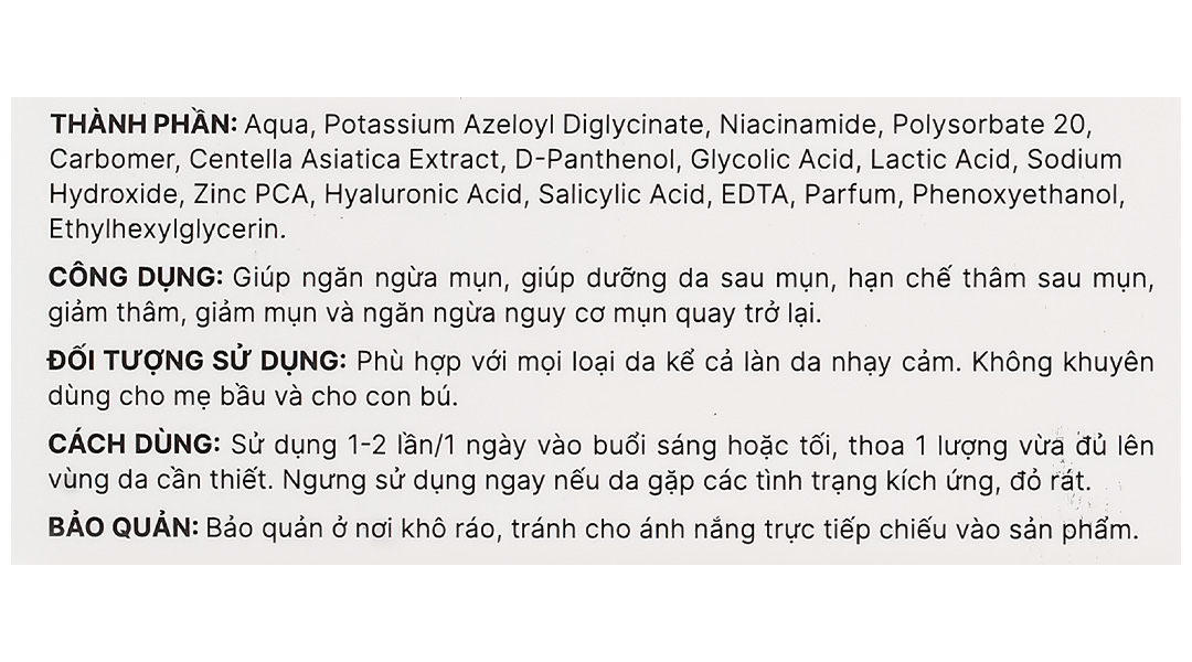 Giúp ngăn ngừa mụn, giúp dưỡng da sau mụn, hạn chế thâm sau mụn, giảm thâm, giảm mụn và ngăn ngừa nguy cơ mụn quay trở lại.