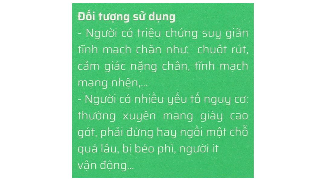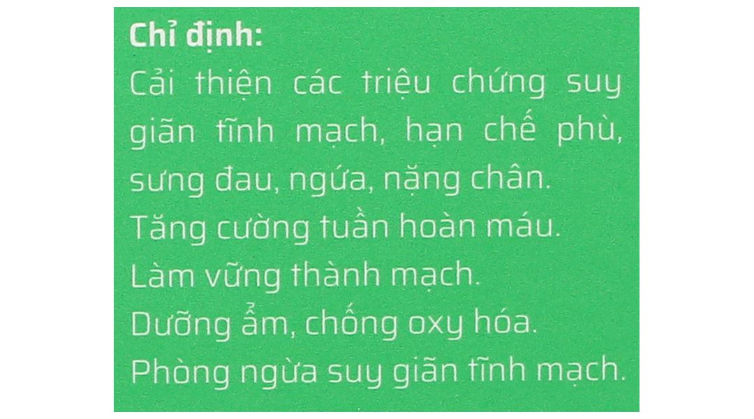 - Cải thiện các triệu chứng suy giãn tĩnh mạch, hạn chế phù, sưng đau, ngứa, nặng chân.