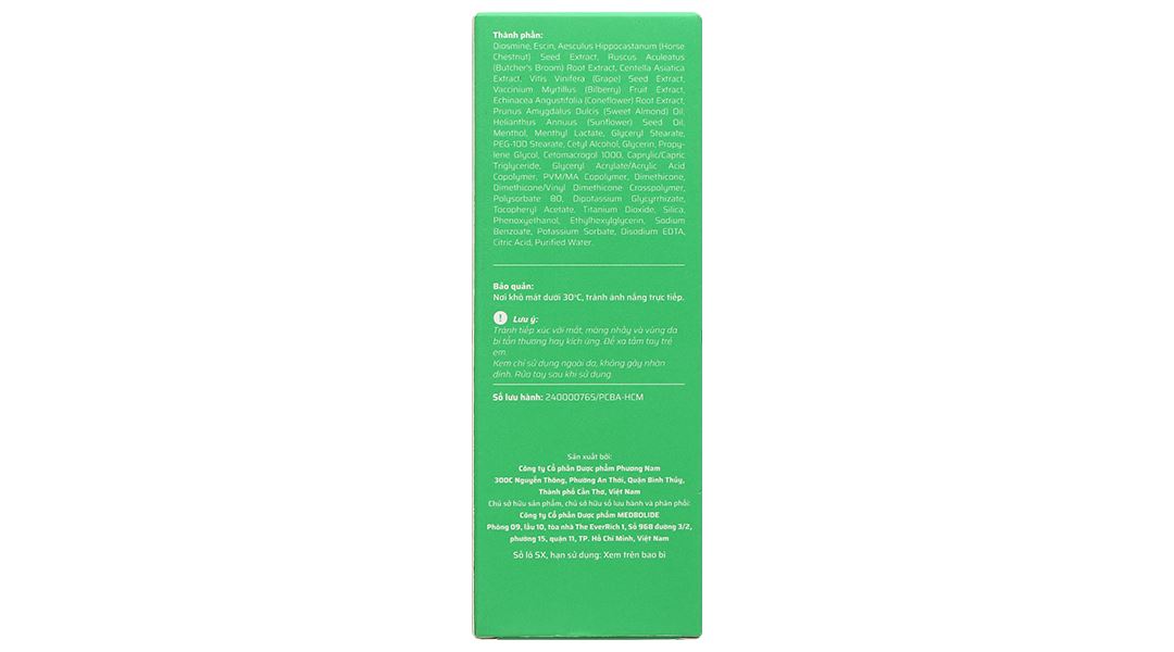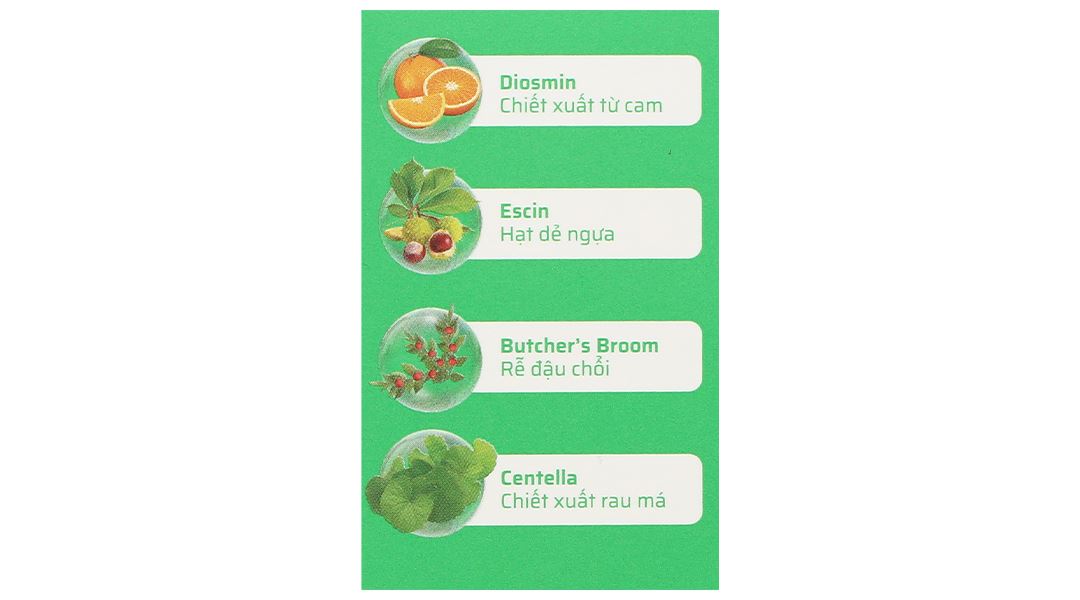 - Vitis Vinifera (Grape) Seed Extract): giúp làm bền thành mạch, chống lại sự suy thoái, đồng thời giúp giảm viêm và tăng cường lưu lượng máu dưới chi.