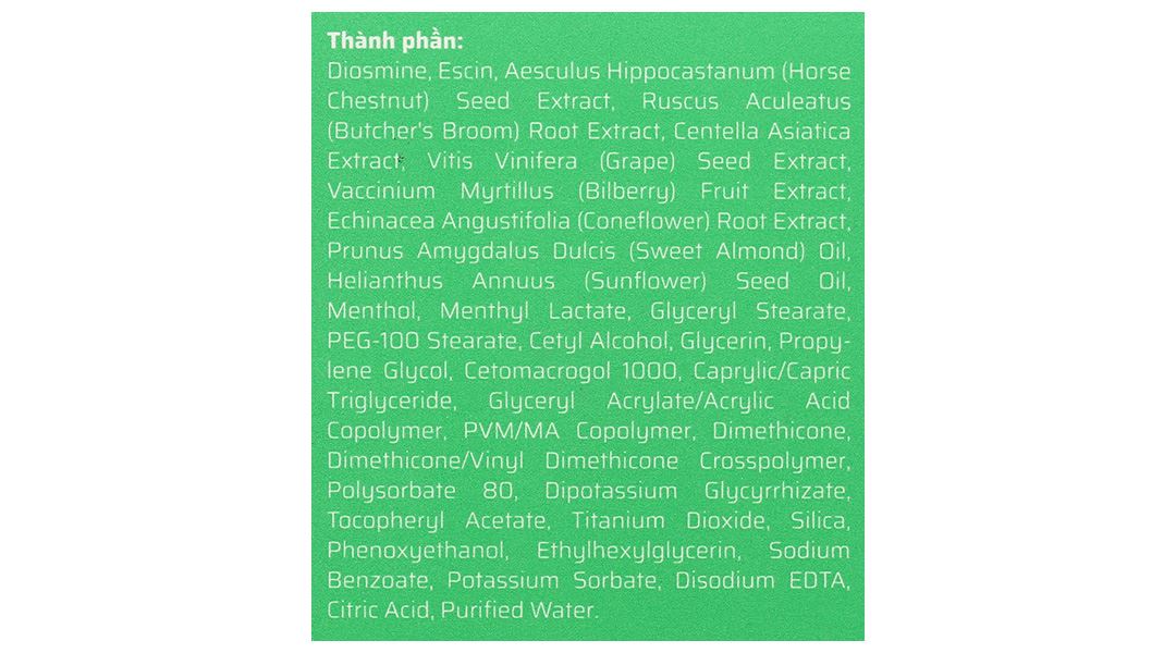 Diosmine, Escin, Aesculus Hippocastanum (Horse Chestnut) Seed Extract, Ruscus Aculeatus (Butcher’s Broom) Root Extract, Centella Asiatica Extract, Vitis Vinifera (Grape) Seed Extract, Vaccinium Myrtillus (Bilberry) Fruit Extract, Echinacea Angustifolia (Coneflower) Root Extract, Prunus Amygdalus Dulcis (Sweet Almond) Oil, Helianthus Annuus (Sunflower) Seed Oil, Menthol, Menthyl Lactate, Glyceryl Stearate, PEG-100 Stearate, Cetyl Alcohol, Glycerin, Propylene Glycol, Cetomacrogol 1000, Caprylic/Capric Triglyceride, Glyceryl Acrylate/Acrylic Acid Copolymer, PVM/MA Copolymer, Dimethicone, Dimethicone/Vinyl Dimethicone Crosspolymer, Polysorbate 80, Dipotassium Glycyrrhizate, Tocopheryl Acetate, Titanium Dioxide, Silica, Phenoxyethanol, Ethylhexylglycerin, Sodium Benzoate, Potassium Sorbate, Disodium EDTA, Citric Acid, Purified Water.