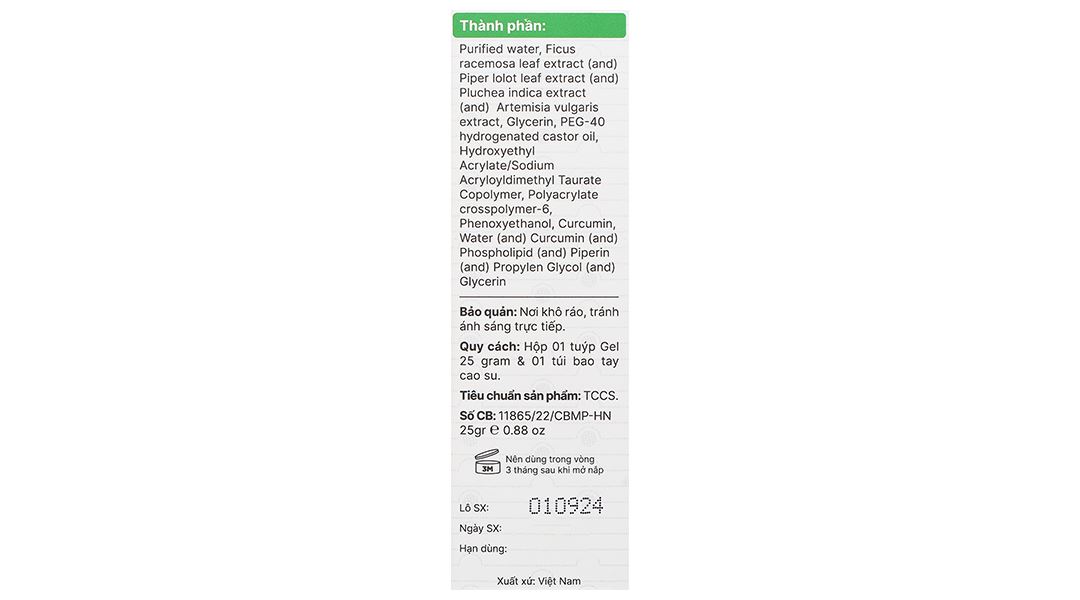 Hoạt chấtSung, Ngải cứu, Cúc tần, Lá lốt, Curcumin