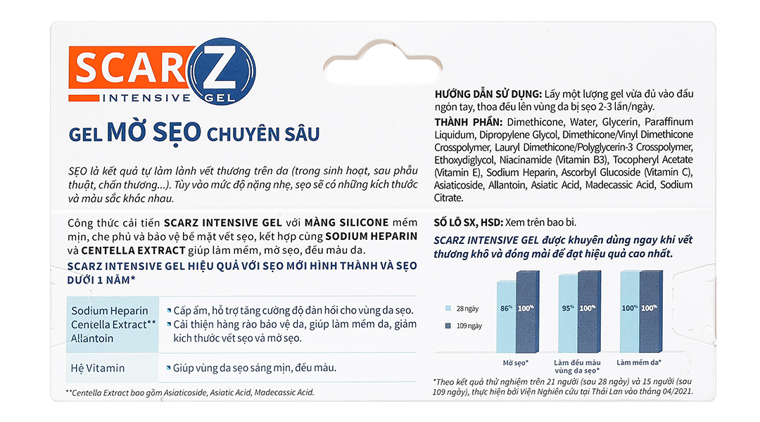 Công thức cải tiến ScarZ Intensive Gel với màng Silicon mềm mịn, che phủ và bảo vệ bề mặt vết sẹo, kết hợp cùng Sodium Heparin và Centella Extract giúp làm mềm, mờ sẹo, đều màu da.