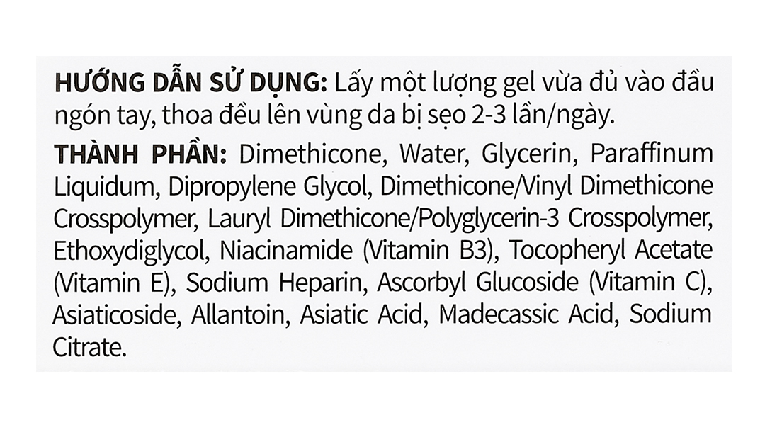 Lấy một lượng gel vừa đủ vào đầu ngón tay, thoa đều lên vùng da bị sẹo 2 – 3 lần/ngày.