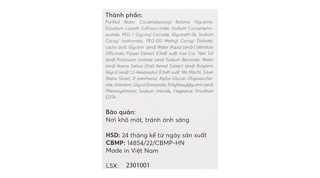 Purified Water, Cocamidopropyl Betaine, Glycerine, Disodium Laureth Sulfosuccinate, Sodium Cocoampho- acetate, PEG-7 Glyceryl Cocoate, Glycereth-26, Sodium Cocoyl Isethionate, PEG-120 Methyl Cocoyl Dioleate, Lactic acid, Glycerin (and) Water (Aqua) (and) Calendula Officinalis Flower Extract (Chiết xuất hoa Cúc Tâm Tư) (and) Potassium Sorbate (and) Sodium Benzoate, Water (and) Avena Sativa (Oat) Kernel Extract (and) Butylene Glycol (and) 1,2-Hexanediol (Chiết xuất Yến Mạch), Silver (Nano Silver), D-panthenol, Alpha-Glucan Oligosaccha- ride, Allantoin, Glycol Distearate, Ethylhexylglycerin (and) Phenoxyethanol, Sodium chloride, Fragrance, Disodium EDTA.