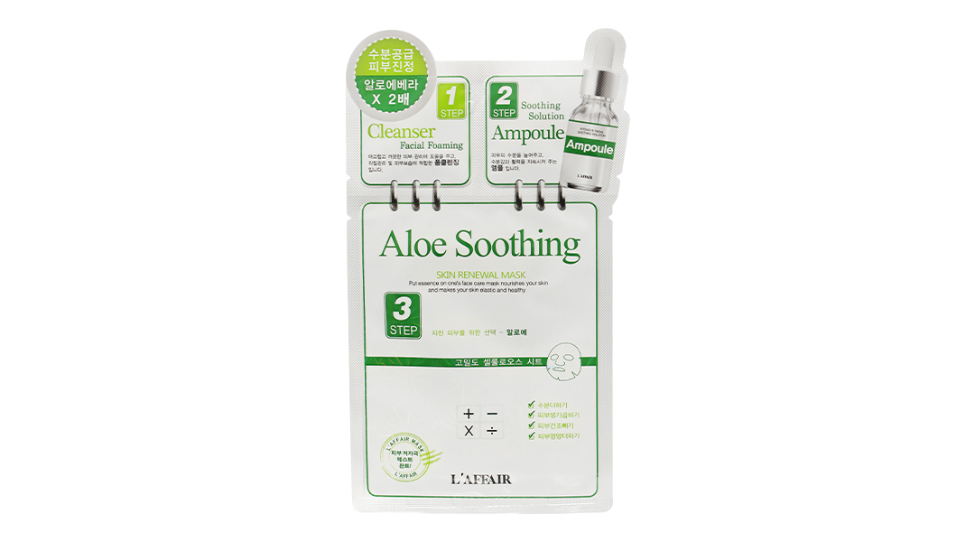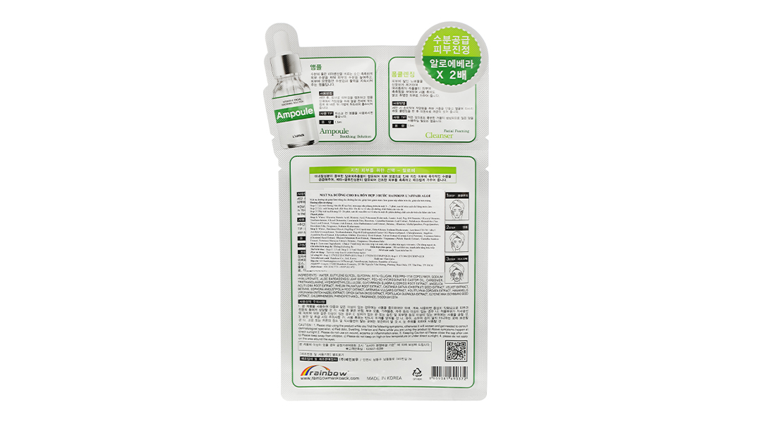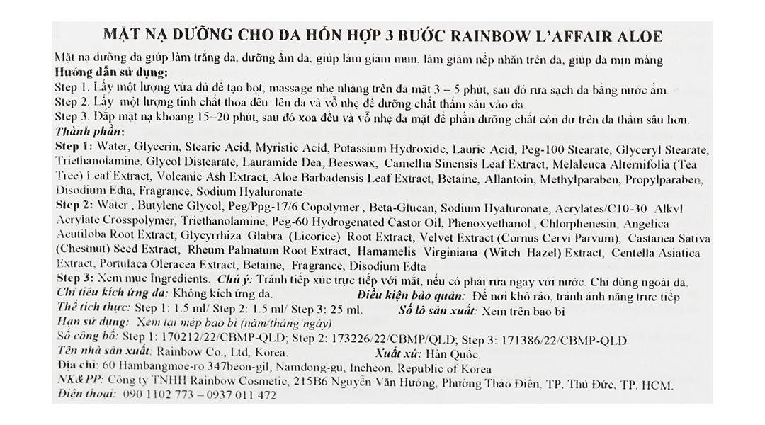 Mặt nạ giấy 3 lớp tinh chất Lô Hội giữ ẩm, làm mịn da Rainbow L’affair 28 ml với kiểu dáng đóng gói hiện đại, 3 bước chăm sóc da độc lập, dễ dàng sử dụng tại nhà hoặc nơi làm việc.