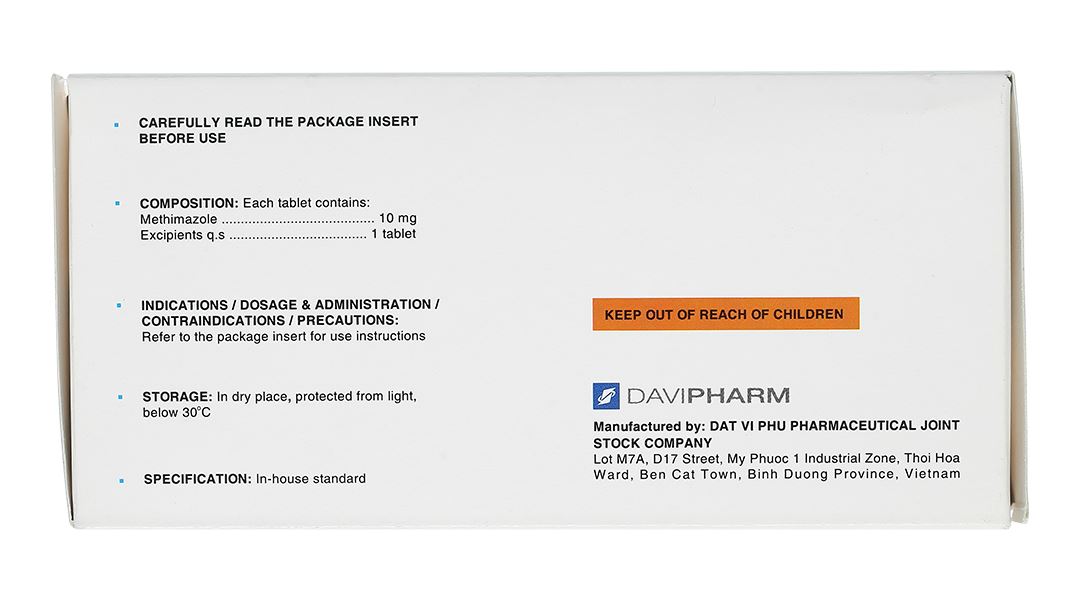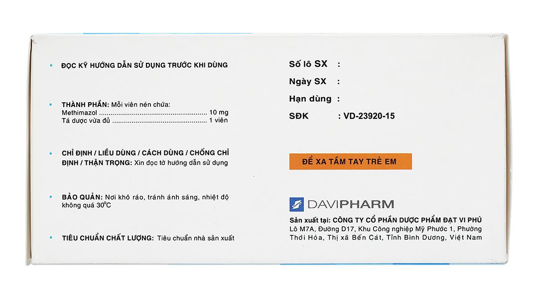 – Thận trọng khi sử dụngPhải có thầy thuốc chuyên khoa chỉ định điều trị và theo dõi trong quá trình điều trị. Cần theo dõi số lượng bạch cầu và công thức bạch cầu trước khi điều trị và hàng tuần trong 6 tháng đầu điều trị, vì có thể xảy ra giảm bạch cầu, suy tủy, nhất là người bệnh cao tuổi hoặc dùng liều từ 40 mg mỗi ngày trở lên. Theo dõi thời gian prothrombin trước và trong quá trình điều trị nếu thấy xuất huyết, đặc biệt là trước phẫu thuật. Để xa tầm tay trẻ em. – Thai kỳ và cho con búThiamazol đi qua nhau thai, nên có thể gây hại cho thai nhi (bướu cổ, giảm năng giáp, một số dị tật bẩm sinh), nhưng nguy cơ thực sự thường thấp, đặc biệt khi dùng liều thấp. Cần cân nhắc lợi/ hại giữa điều trị và không điều trị. Trong trường hợp phải điều trị, propylthiouracil thường được chọn dùng hơn, vì thuốc qua nhau thai ít hơn thiamazol. Khi dùng thiamazol, phải dùng liều thấp nhất có hiệu lực để duy trì chức năng giáp của người mẹ ở mức cao trong giới hạn bình thường của người mang thai bình thường, đặc biệt trong 3 tháng cuối thai kỳ. Giảm năng giáp và bướu cổ ở thai nhi thường xảy ra khi dùng thuốc kháng giáp tới gần ngày sinh, vì tuyến giáp thai nhi chưa sản xuất hormon giáp cho tới tuần thứ 11 hoặc 12 thai kỳ. Tăng năng giáp có thể giảm ở người mẹ khi thai tiến triển, nên ở một số người có thể giảm liều thiamazol, có khi ngừng điều trị trong 2 – 3 tháng trước khi đẻ. Hormon giáp qua nhau thai rất ít, nên ít có khả năng bảo vệ cho thai nhi. Không nên dùng các hormon giáp trong khi mang thai, vì thuốc có thể che lấp các dấu hiệu thoái lui của cường giáp, và tránh được tăng liều thiamazol một cách vô ích, gây thêm tác hại cho mẹ và thai nhi. – Khả năng lái xe và vận hành máy mócThuốc có thể gây chóng mặt, buồn ngủ. Vì vậy, nên thận trọng khi lái xe hoặc vận hành máy móc. – Tương tác thuốcVới aminophylin, oxtriphylin hoặc theophylin: Khi cường giáp, sự chuyển hóa các thuốc này tăng. Dùng thiamazol, nếu tuyến giáp trở về bình thường, cần giảm liều các thuốc này. Với amiodaron, iodoglycerol, iod hoặc KI: Các thuốc có iod làm giảm đáp ứng của cơ thể với thiamazol. Vì vậy, phải dùng liều thiamazol tăng (amiodaron có 37% iod). Với thuốc chống đông dẫn chất coumarin hoặc indandion: Thiamazol có thể làm giảm prothrombin huyết, nên tác dụng của các thuốc chống đông uống tăng. Do đó, cần điều chỉnh liều thuốc chống đông dựa vào thời gian prothrombin. Với thuốc chẹn beta, glycosid tim: Cường giáp làm tăng chuyển hóa và thải trừ thuốc chẹn beta hoặc glycosid tim, cần giảm liều các thuốc này khi tuyến giáp người bệnh trở về bình thường do dùng thiamazol. Với muối iod phóng xạ 131I: Thiamazol làm giảm thu nạp 131I vào tuyến giáp. Nếu ngừng thiamazol đột ngột, thì sau khoảng 5 ngày, sự thu nạp 131I sẽ tăng trở lại. |