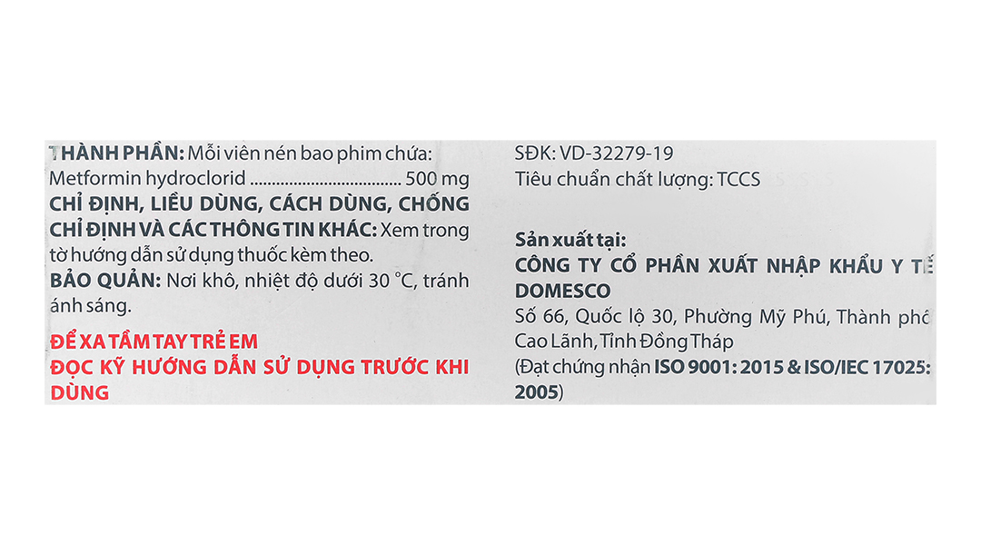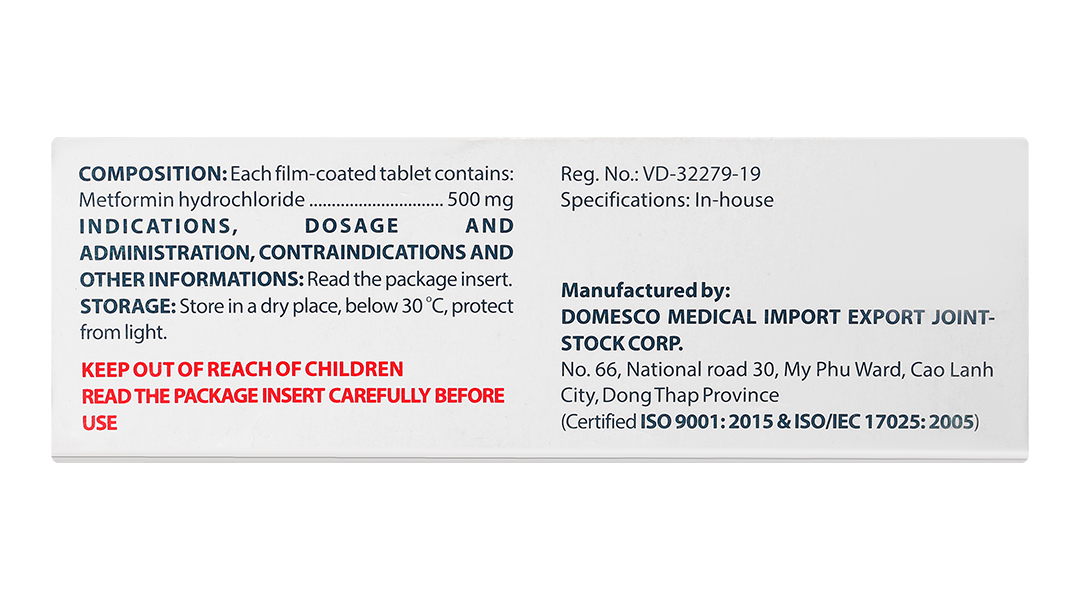 - Thành phần dược chất: Metformin hydroclorid 500mg.