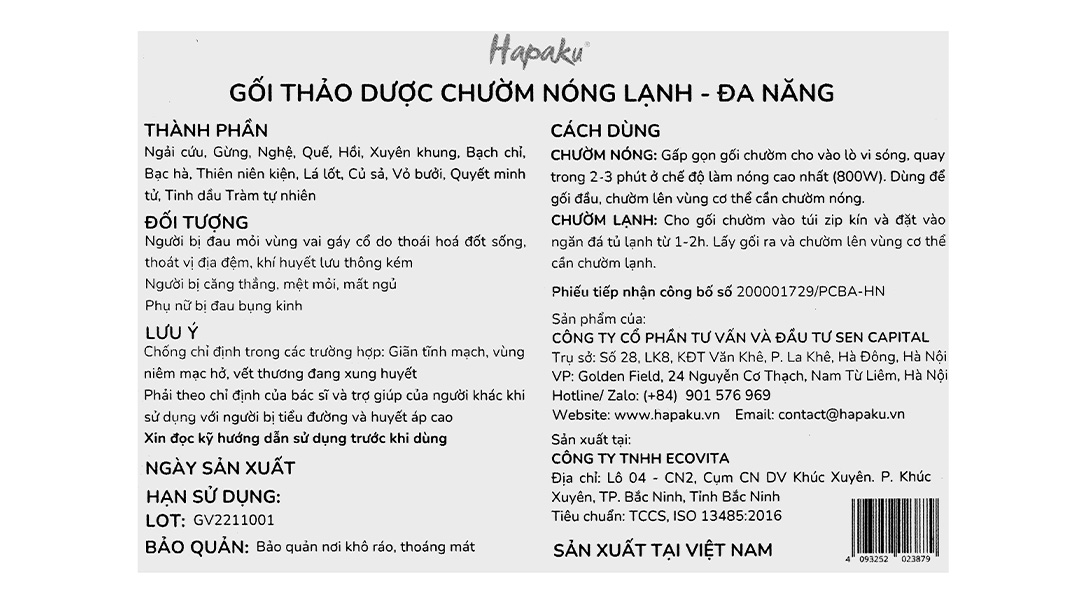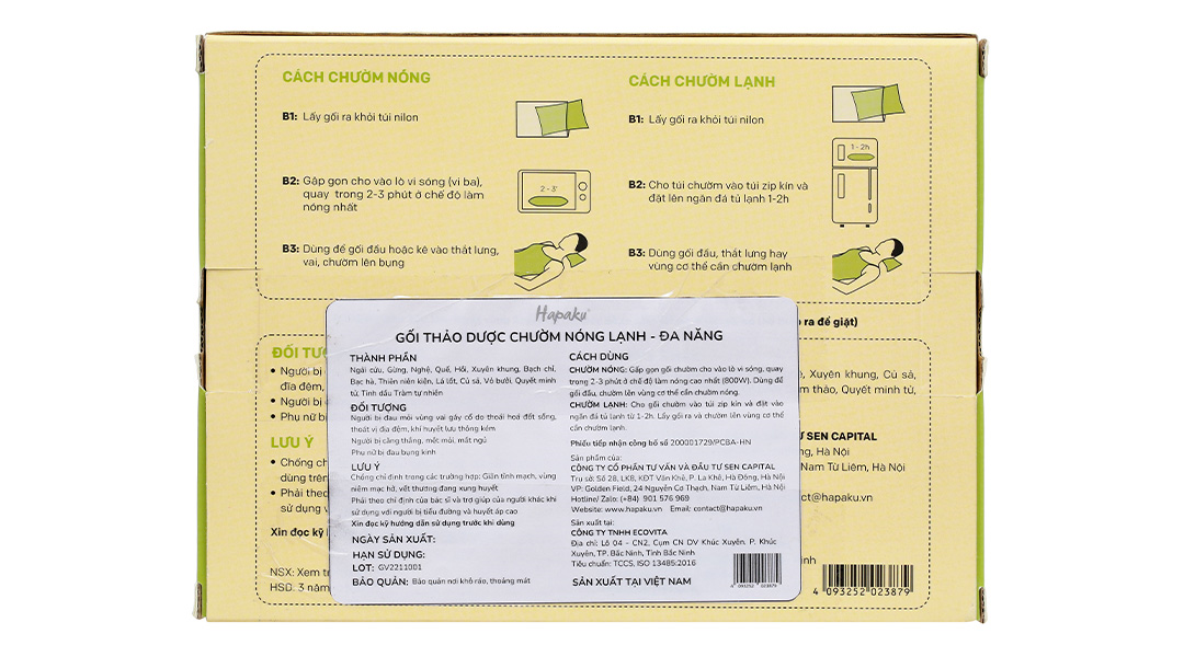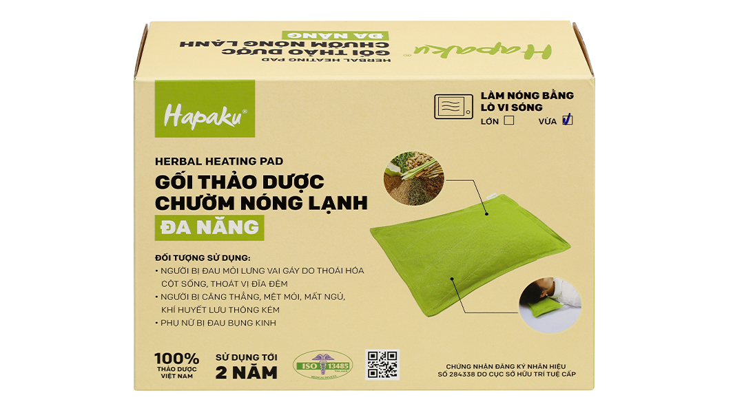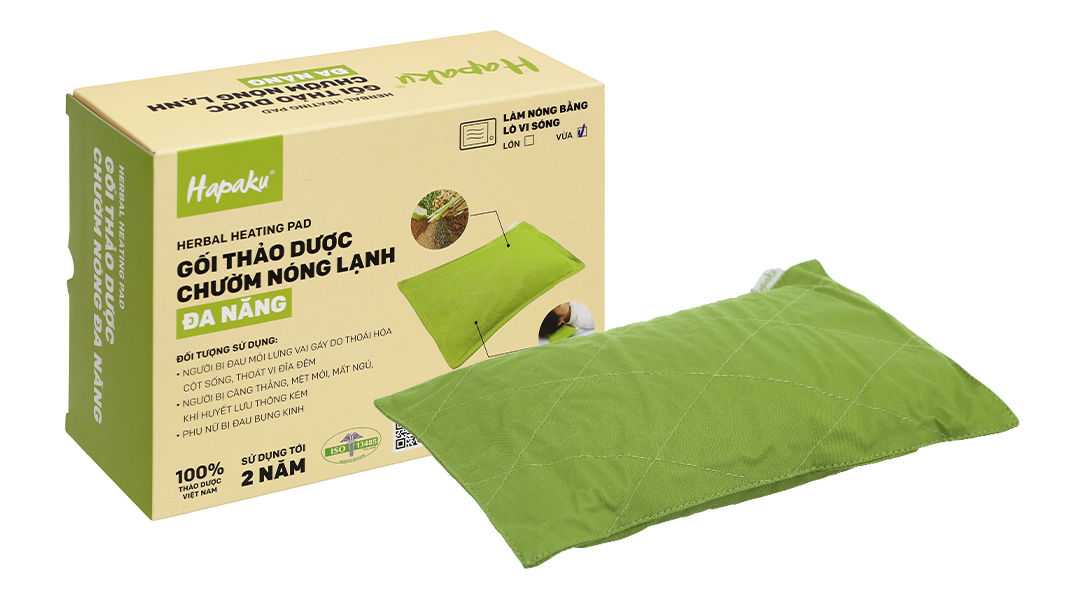 Gối chườm thảo dược nóng lạnh đa năng Hapaku – sản phẩm kết hợp độc đáo giữa liệu pháp chườm nóng và thảo dược truyền thống Việt Nam.