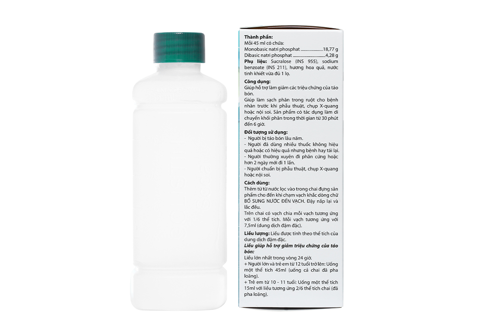 Hoạt chất: Monobasic natri phosphat 18,77 g, dibasic natri phosphat 4,28 g.