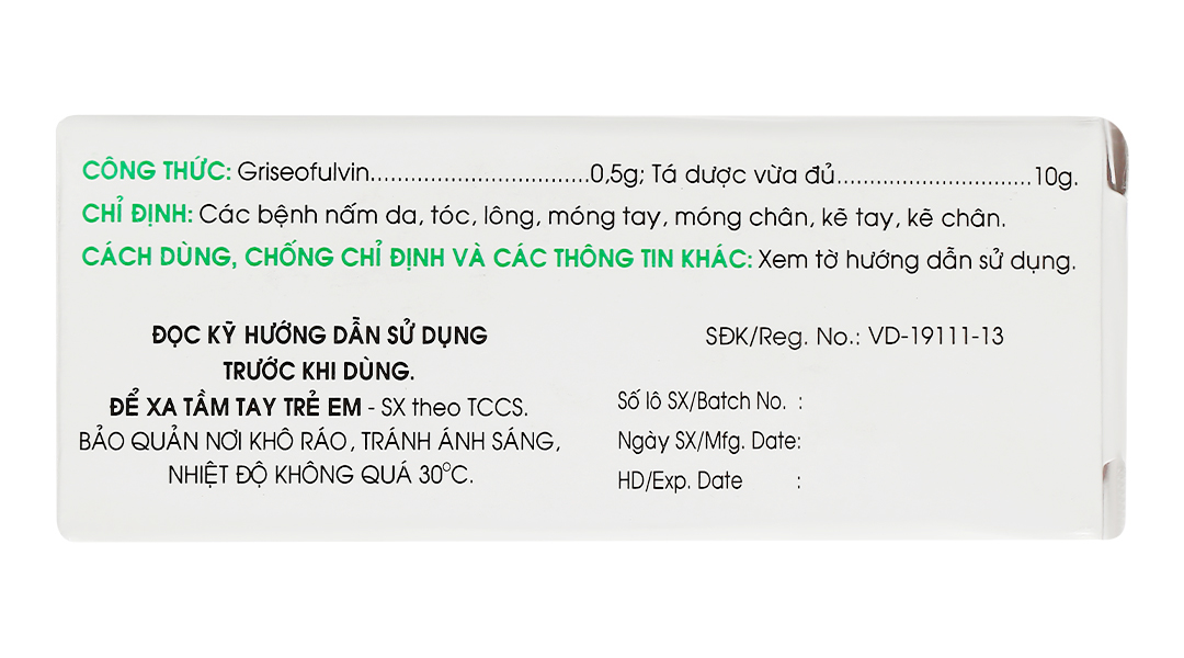 Công dụngCác bệnh nấm ngoài da, tóc, lông, nấm móng tay, móng chân, kẽ tay, kẽ chân