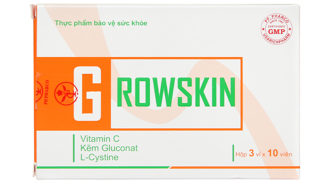 Growskin là sự kết hợp hoàn hảo của các thành phần chống oxy hóa mạnh như: Vitamin C, Vitamin E và các chất như L-Cystine, Kẽm gluconat, giúp cung cấp đầy đủ dưỡng chất thiết yếu cho làn da từ sâu bên trong, hỗ trợ da chống lại sự tấn công của các gốc tự do, giảm thiểu các dấu hiệu lão hóa và làm đẹp da một cách tự nhiên và hiệu quả.