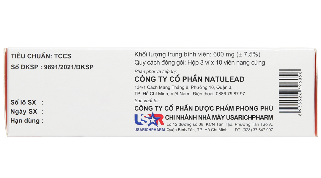 Phụ liệu: Chất độn (Lactose, Tinh bột lúa mì), chất kết dính (Hydroxypropyl methylcellulose, Natri croscamellose), chất chống đông vón (Calcium silicate, Magnesium stearate, Talc), vỏ nang gelatin vừa đủ 1 viên.