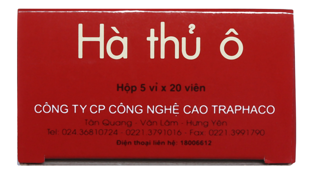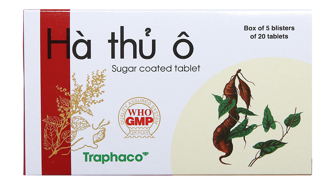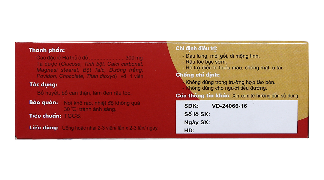 - Hoạt chất: Cao đặc rễ Hà thủ ô đỏ (Extractum Radix Fallopiae multiflorae) 300 mg (Tương đương 1,5g rễ hà thủ ô đỏ).
