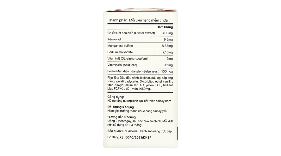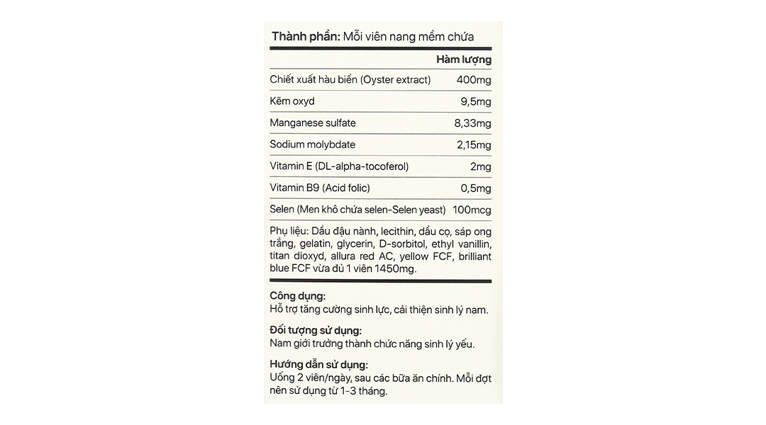 Chiết xuất hàu biển (Oyster extract) | 400 mg |