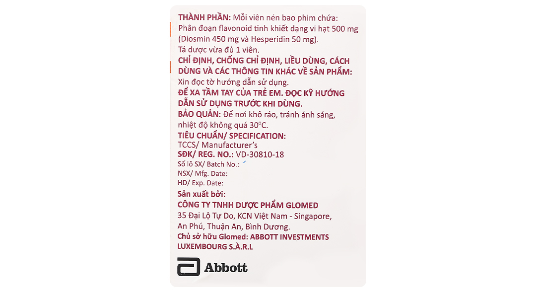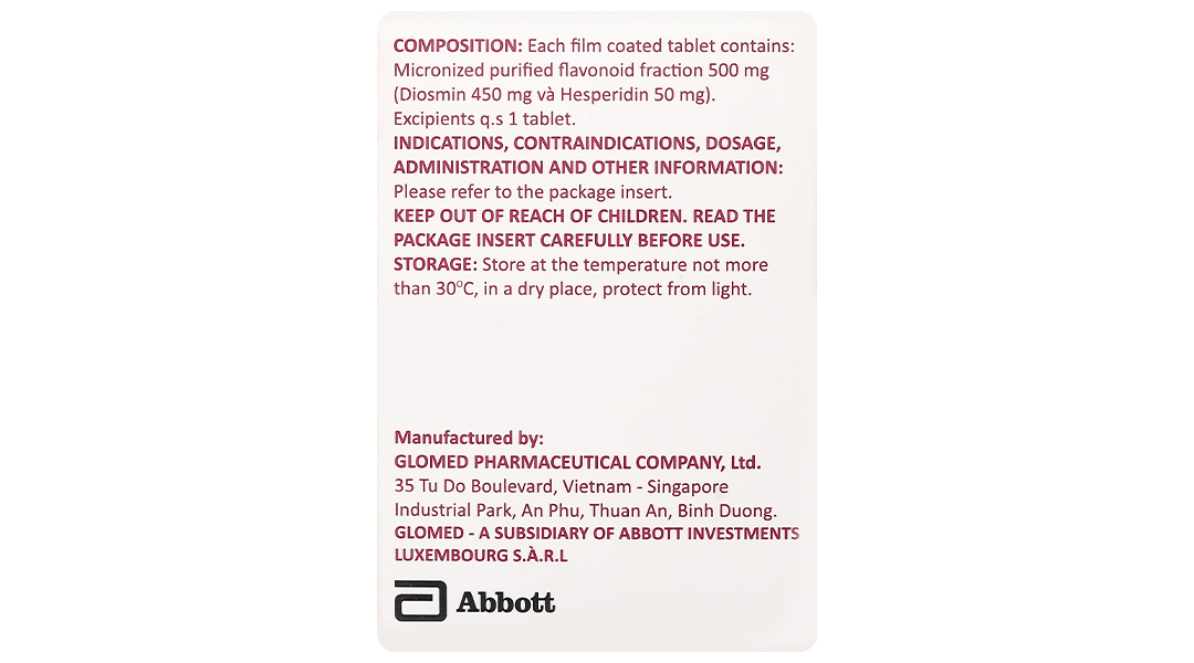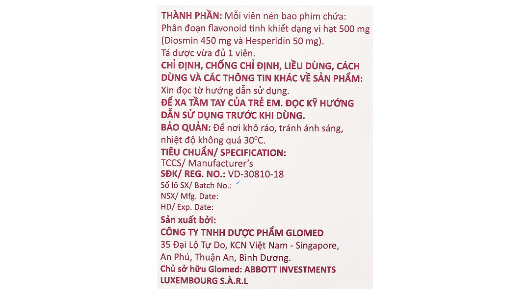 - Thành phần hoạt chất: Phân đoạn flavonoid tinh khiết dạng vi hạt 500 mg (diosmin 450 mg và hesperidin 50 mg).
