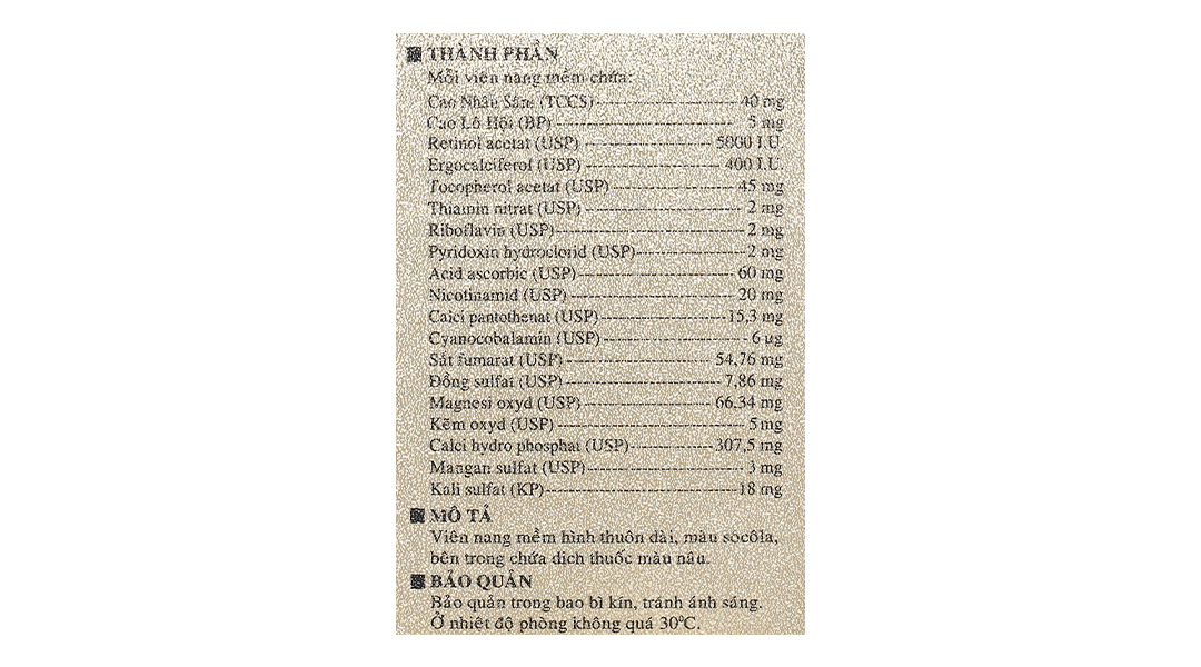 - Hoạt chất chính: Cao Nhân Sâm (TCCS) 40mg, Cao Lô Hội (BP 2012) 5mg, Retinol acetat (USP 34) 5000 I.U, Ergocalciferol (USP 34) 400 I.U, Tocopherol acetat (USP 34) 45mg, Thiamin nitrat (USP 34) 2mg, Riboflavin (USP 34) 2mg, Pyridoxin HCL (USP 34) 2mg, Acid ascorbic (USP 34) 60mg, Nicotinamid (USP 34) 20mg, Calci pantothenat (USP 34) 15.3mg, Cyanocobalamin (USP 34) 6µg, Sắt fumarat (USP 34) 54.76mg, Đồng sulfat (USP 34) 7.86 mg, Magnesi oxyd (USP 34) 66.34 mg, Kẽm oxyd (USP 34) 5mg, Calci hydro phosphat (USP 34) 307.5 mg, Mangan sulfat (USP 34) 3mg, Kali sulfat ( KP.IX) 18mg.