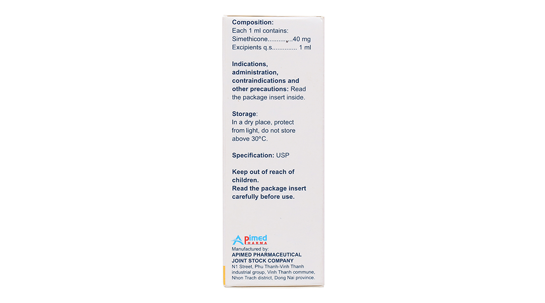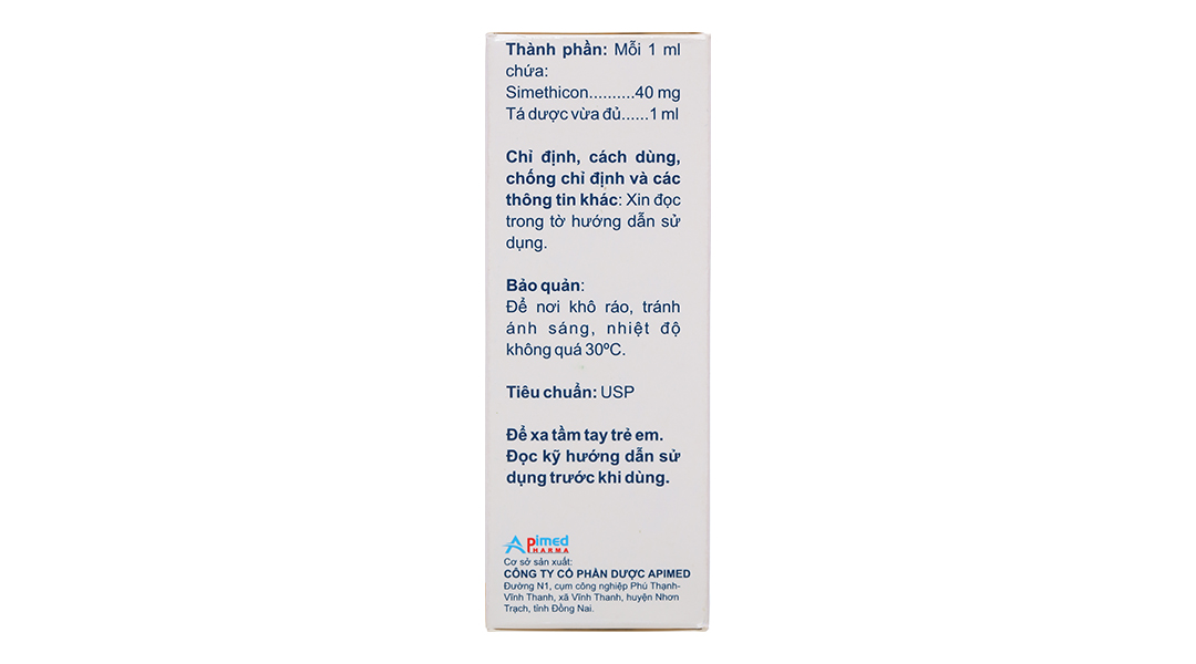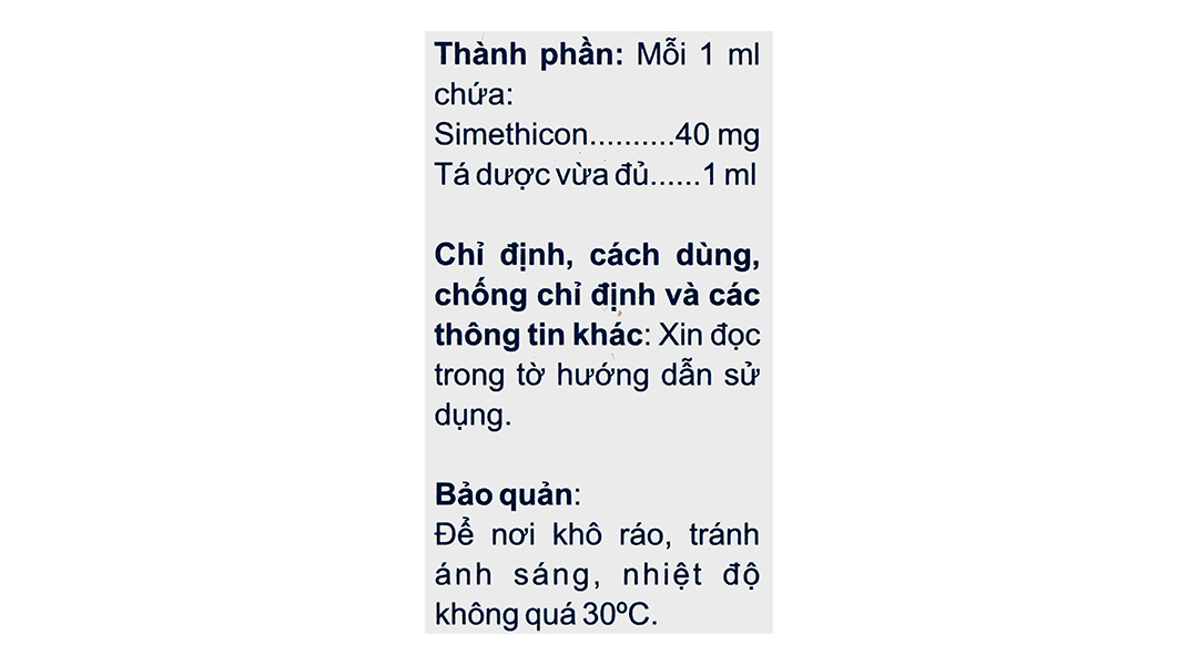 – Thận trọng khi sử dụng– Không dùng quá liều khuyến cáo. – Tránh đồ uống có carbonat (soda hoặc nước ngọt) hoặc các thức ăn có thể làm tăng lượng khí trong dạ dày. – Cảnh báo tá dược: Thành phần của thuốc có chứa natri benzoat, có thể làm tăng nguy cơ vàng da, vàng mắt ở trẻ sơ sinh (4 tuần tuổi trở xuống). – Chỉ sử dụng thuốc trong vòng 30 ngày kể từ lần mở nắp đầu tiên. – Thai kỳ và cho con búPhụ nữ có thai: Không rõ thuốc có qua được nhau thai hay không, nhưng do hấp thu của simethicon qua ruột bị hạn chế, điều đó làm giảm khả năng phơi nhiễm đối với thai nhi. Phụ nữ cho con bú: Không có báo cáo về dùng thuốc trong thời kỳ cho con bú hoặc đo lượng thuốc được bài tiết vào sữa. Không biết simethicon có được bài tiết vào sữa mẹ hay không cũng như không rõ khả năng gây ra các ADR ở trẻ bú mẹ. Cần cân nhắc nguy cơ lợi ích khi sử dụng thuốc này cho bà mẹ đang cho con bú. – Khả năng lái xe và vận hành máy mócChưa có bằng chứng về ảnh hưởng của thuốc lên khả năng lái xe và vận hành máy móc. – Tương tác thuốcLevothyroxin có thể liên kết với simethicon. Sự hấp thu của levothyroxin có thể bị giảm nếu simethicon được cho dùng đồng thời ở trẻ để điều trị các rối loạn tuyến giáp. Nếu dùng đồng thời hai thuốc này phải uống cách nhau ít nhất 4 giờ. Theo dõi mức TSH và/hoặc các đánh giá khác về chức năng tuyến giáp khi bắt đầu dùng hoặc ngừng dùng simethicon trong khi điều trị bằng levothyroxin. |