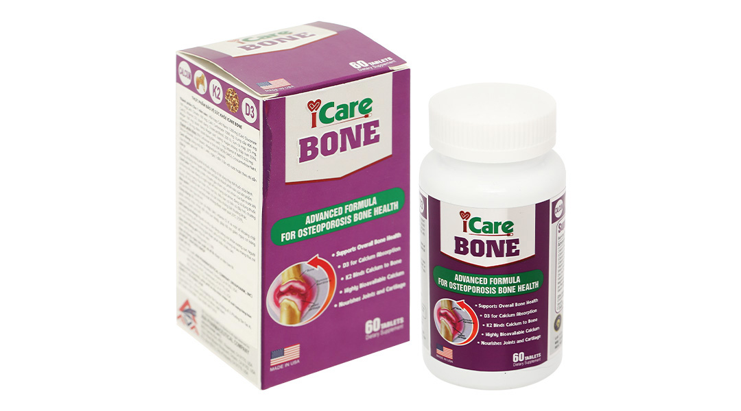 Thành phần chính của Icare Bone là hỗn hợp các loại Calci kết hợp cùng với sụn cá mập, vitamin D, K và các thành phần khác giúp cho xương chắc khỏe và phòng ngừa loãng xương. Hỗ trợ tăng tiết dịch khớp.
