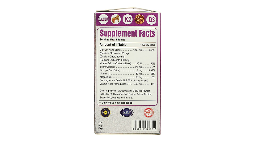 Hỗn hợp Calci Nano 1200mg [Calci gluconate 100mg, Calci Citrate 100mg, Calci Carbonate 1000mg (cung cấp 406mg Calci)], Vitamin D3 (dưới dạng Cholecalciferol) 200IU, Sụn cá mập 375mg, Magie 100mg (dưới dạng Magie oxit, lượng magie không thấp hơn 55%), Vitamin C 50mg, Kẽm (dưới dạng Kẽm oxit) 1mg, Vitamin K (MK7 0.03mg).