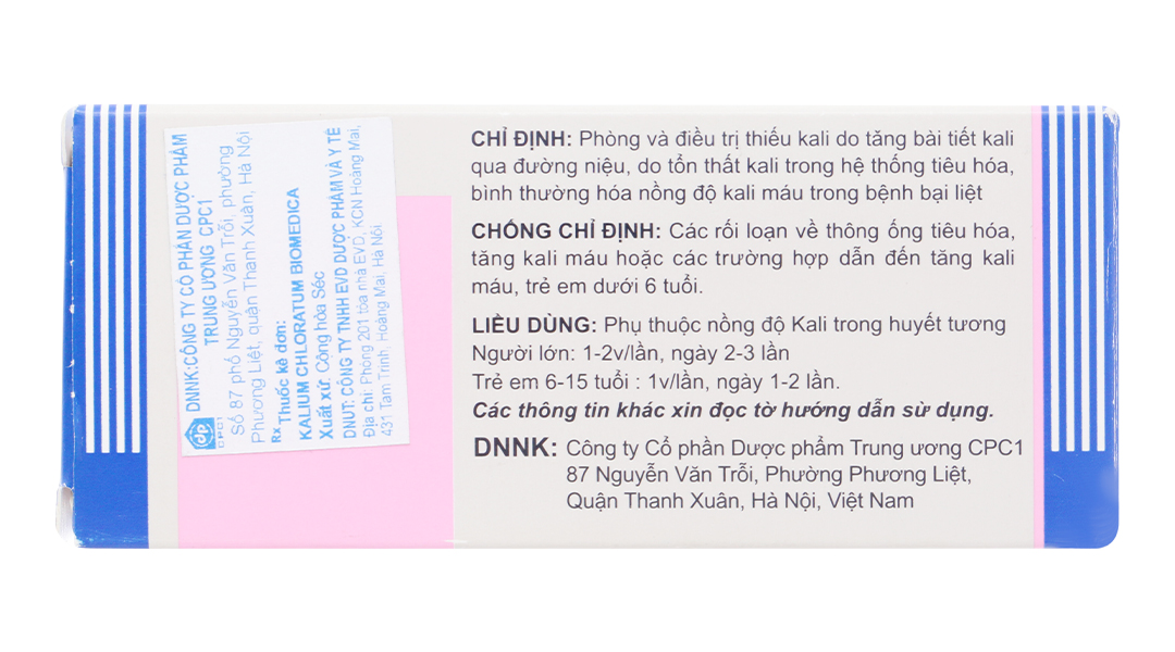 Hoạt chất: Kali clorid 0,5g (tương đương 6,75 mmol K*).