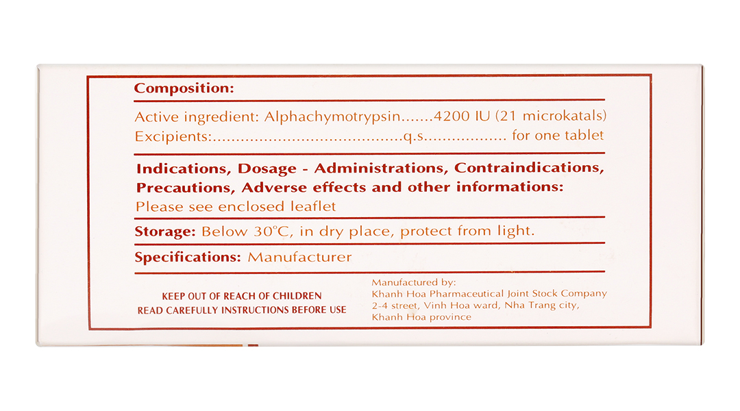 Thành phần dược chất: Alphachymotrypsin 4200 IU (21 microkatals).