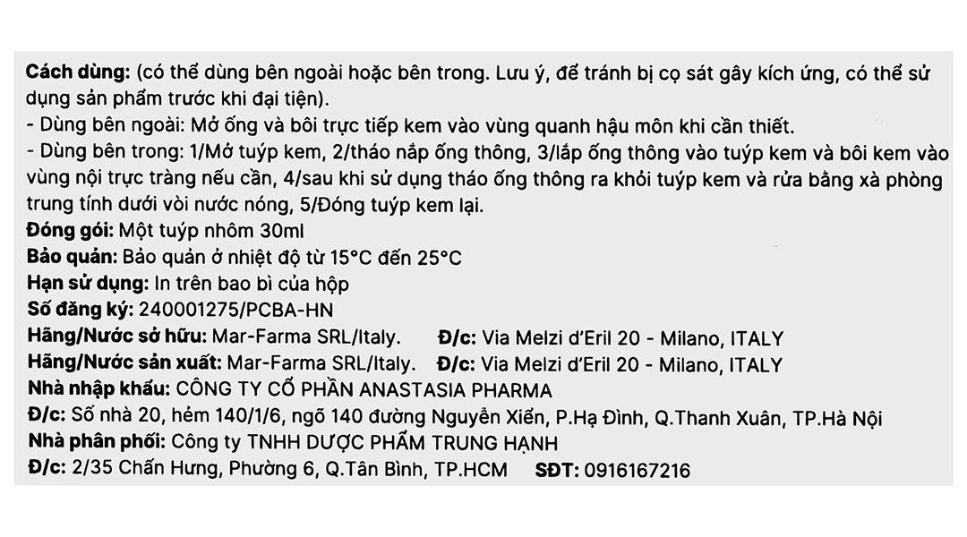 - Dùng bên ngoài: Mở ống và bôi trực tiếp kem vào vùng quanh hậu môn khi cần thiết.